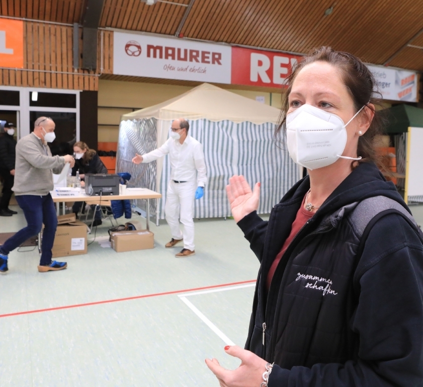 Etwa zwanzig Menschen stehen vor der Ballspielhalle in Korb. Mit Maske und Abstand. In der Hand halten sie ihre Impfausweise und Dokumente, die sie für die Impfung brauchen. Eine Frau läuft mit ihrem Mann vom Parkplatz zum Eingang. „Unsere Tochter hat die Termine für uns gebucht“, sagt die Frau, die ihren Namen nicht in der Zeitung lesen möchte. Ende Juni seien die beiden das zweite Mal geimpft worden. Eigentlich hätten sie einen Termin vor Weihnachten gehabt, sagen die Korber, „aber wir