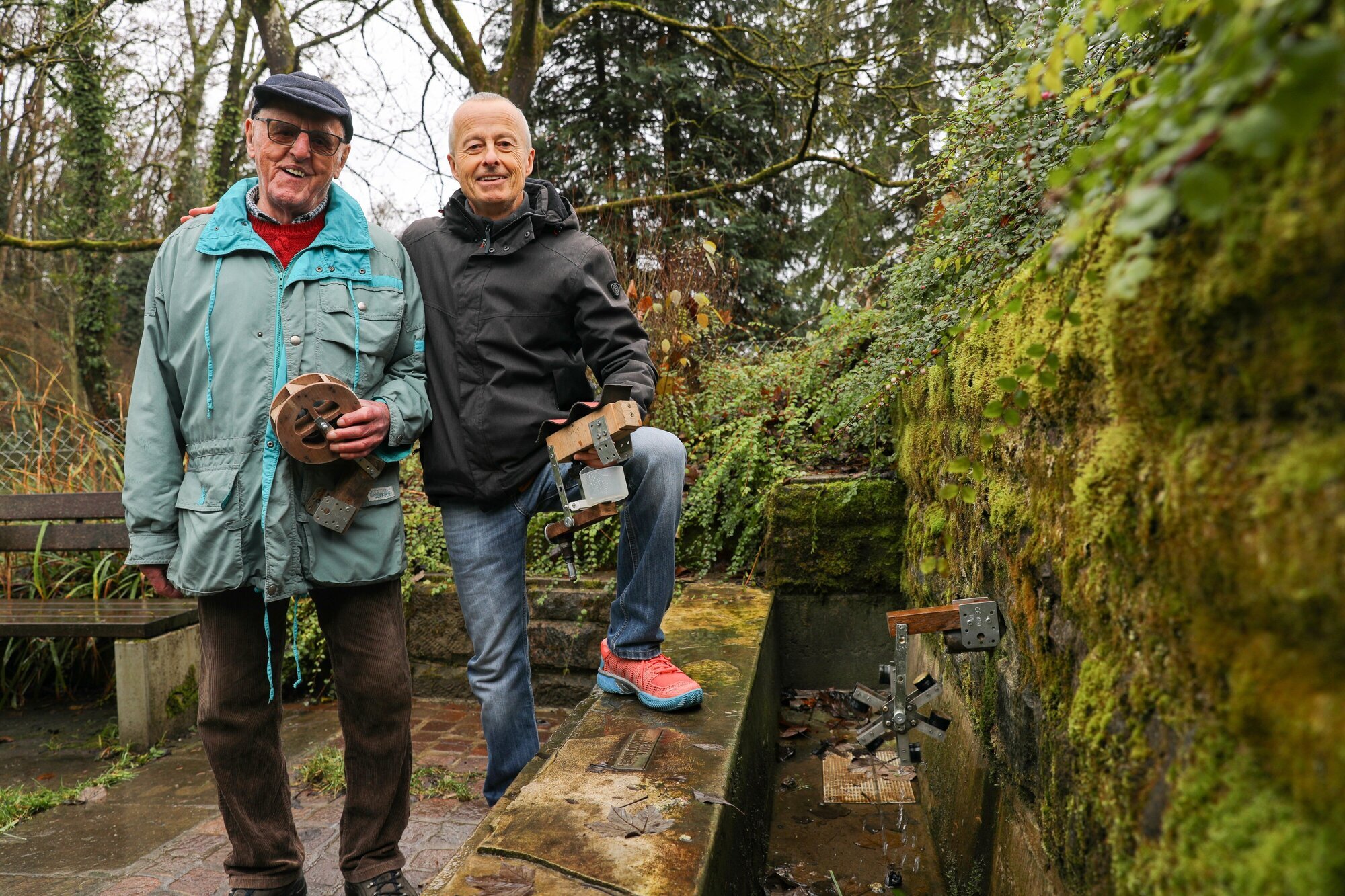 Korb. Wenn man den schmalen Weg zum „Brünnele“ in Korb entlang spaziert, hört man es oft, schon bevor man es sieht: das helle Klackern, Plätschern und Surren kleiner Wasserräder, die sich fröhlich im Wasser drehen. Für viele Spaziergänger, vor allem für Kinder, ist dieser Ort ein kleines Highlight. Dass die Miniaturmühlen inzwischen zu einem richtigen Anziehungspunkt geworden sind, liegt an zwei Männern, die die Räder in Bewegung gebracht haben: Willi Bäder, 93 Jahre alt