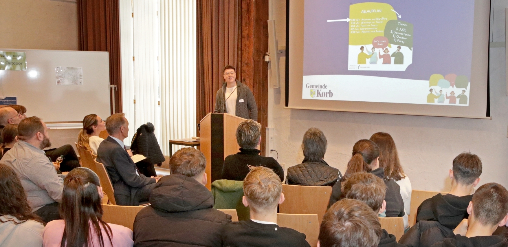 Was bewegt die nachkommende Generation in Korb? Und sind ihre Erwartungen an ihre Heimatgemeinde tatsächlich so viel anders als die von älteren Korbern? Bei der 14. Ortsjugendkonferenz sprechen die Schüler direkt mit Gemeinderatsmitgliedern und Rathausmitarbeitern. Auf der Wunschliste stehen etwa ein Skatepark und Orte, an denen die Jugendlichen ungestört „chillen“ können – am Seeplatz fühlen sie sich offenbar nicht immer sicher.