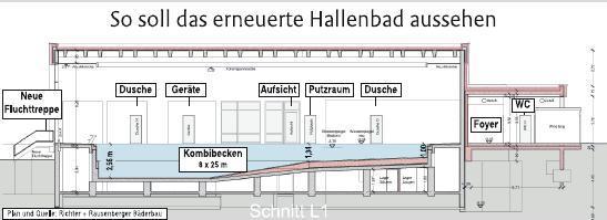 Wie das neue Hallenbad aussehen soll, zeigen Richter und Rausenberger mit Grundrissen, Quer- und Längsschnitten. Von außen gesehen ändert sich nicht viel: Die Glasfassade der Schwimmhalle bleibt erhalten, alle Fenster werden erneuert. Das Dach wird voraussichtlich ertüchtigt, abgedichtet und begrünt. Nur falls die Wärmedämmung durchfeuchtet sein sollte, wird das Dach abgeräumt und neu gedämmt.