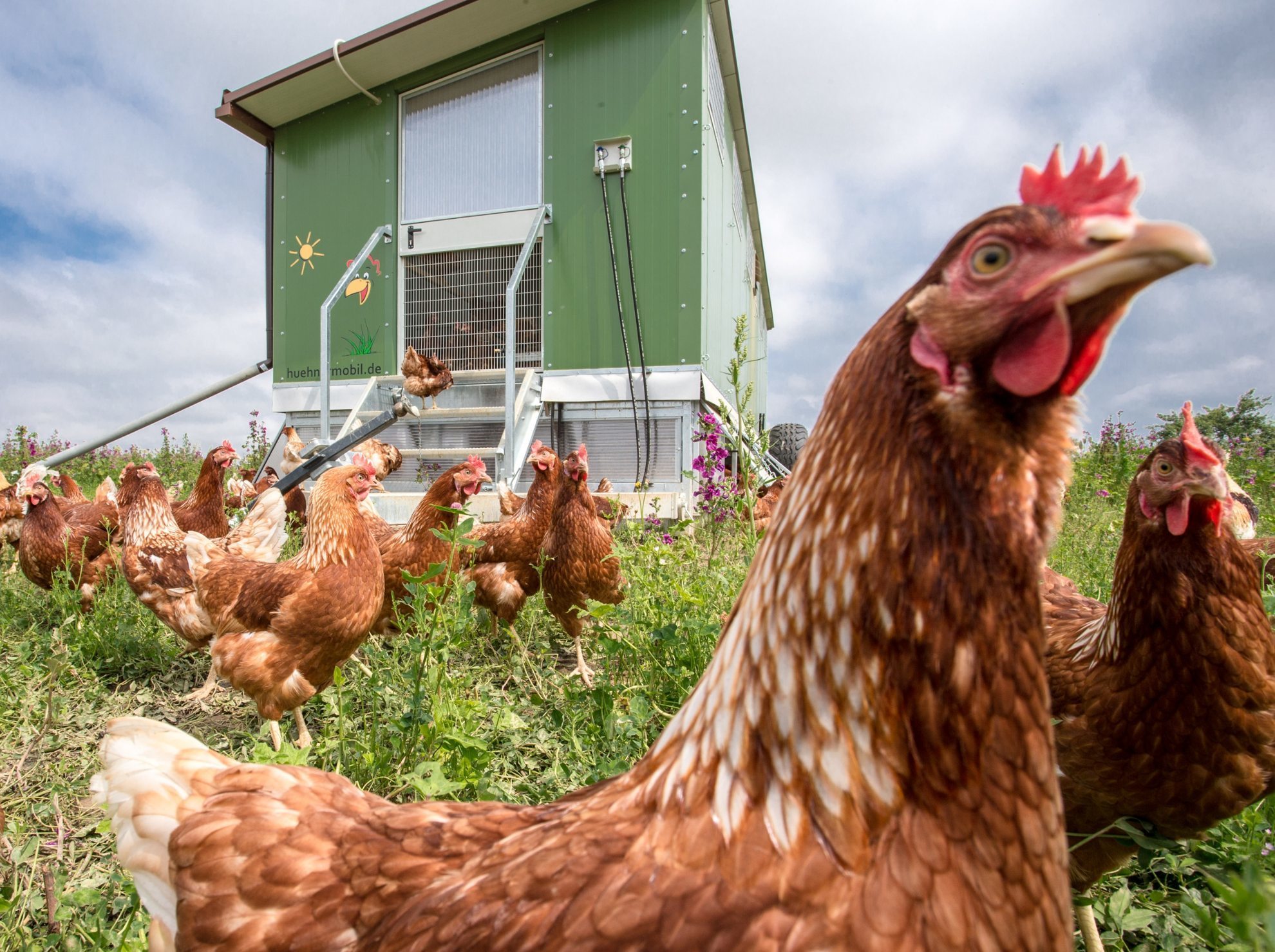 Das Hühnermobil hat er seit längerem im Kopf gehabt. Ein stationärer Freilandstall sei sehr teuer und für ihn auch nicht ganz überzeugend als Freilandhaltung. Hier auf der Wiese hätten die Hühner immer frisches Gras, könnten in kleineren Einheiten zusammenleben, was für sie als geradezu familiäre Tiere wichtig sei. Die Kosten für den Anhänger gibt Häußermann als „hohen fünfstelligen Betrag“ an.