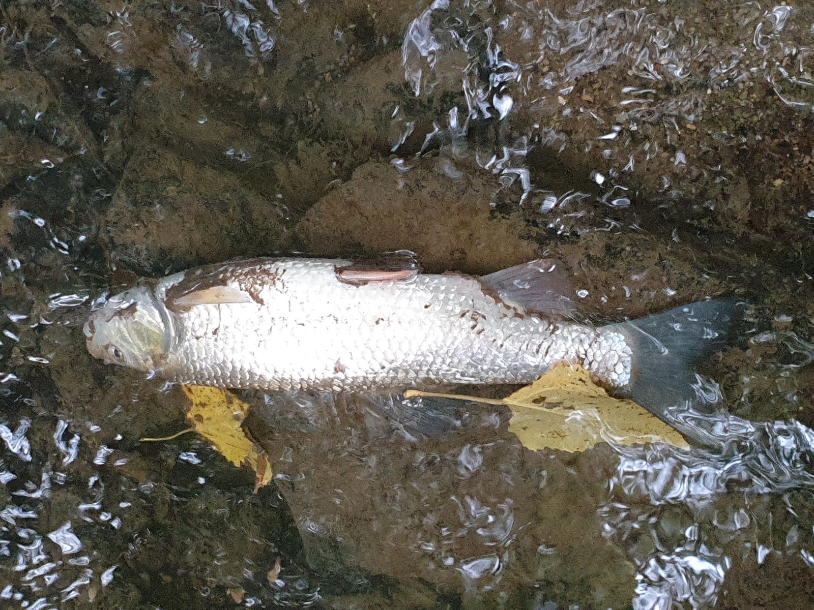 Trauriges Bild am Ufer des Buchenbachs: Angeschwemmte tote Fische liegen im Wasser. Markus Wolf, einer der Leutenbacher Angler spricht von einem Fischsterben. Weil er beruflich eingespannt war, hatte er sich selbst erst am Mittwoch um den Buchenbach kümmern können. Von befreundeten Anglern hatte er allerdings zuvor schon Berichte bekommen, dass tote Fische im Bach liegen.