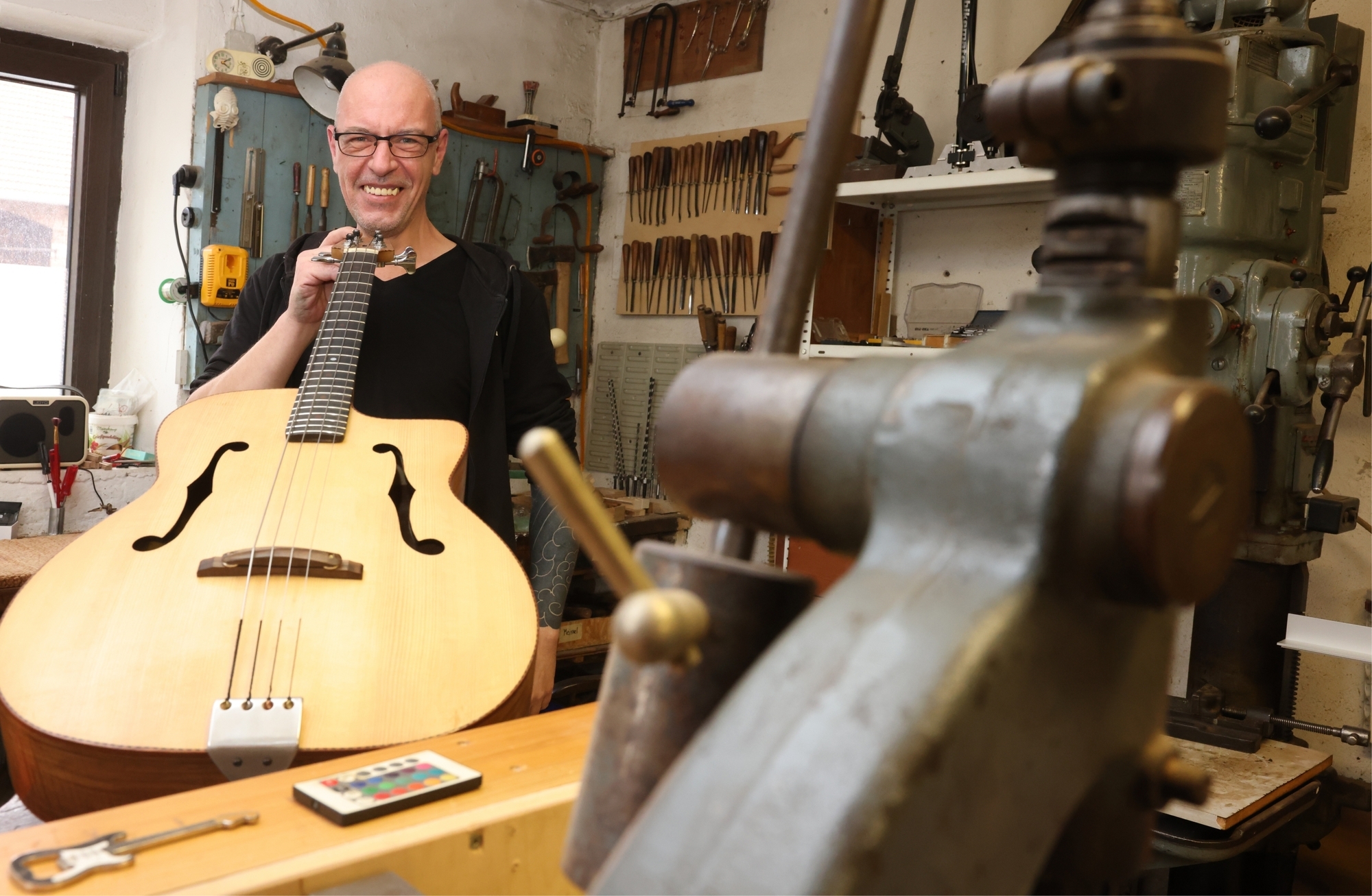 Eine handgemachte Gitarre, ein individuelles Stück, das gut klingen und ergonomisch-handlich sein soll – Georg Zaiß (55) stellt sie seit einer Weile hauptberuflich her. Der Autodidakt hat Wohnung und Werkstatt im September 2021 im Gollenhof bei Weiler zum Stein gefunden, wo er demnächst, am 6. Mai, für die interessierte Kundschaft im ersten Stock einen gemütlichen Showroom mit Sofa und Verstärkern eingerichtet hat.
