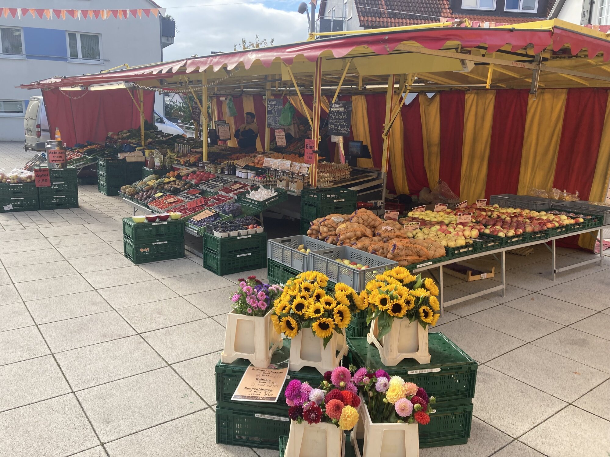 Leutenbach. Arg viel los ist nicht auf dem Wochenmarkt mitten unter Woche. Der Löwenplatz wird nicht gerade überrannt an diesem spätsommerlichen Vormittag im Herbst (15.10.). Aber vielleicht trügt ja der Augenschein und die Marktbeschicker sehen das ganz anders. Von der Pop-Up-Redaktion der Winnender Zeitung nebenan (noch bis einschließlich 16.10.) sind es nur ein paar Schritte zu ihnen. Was liegt also näher, als sich dort mal umzuhören?
