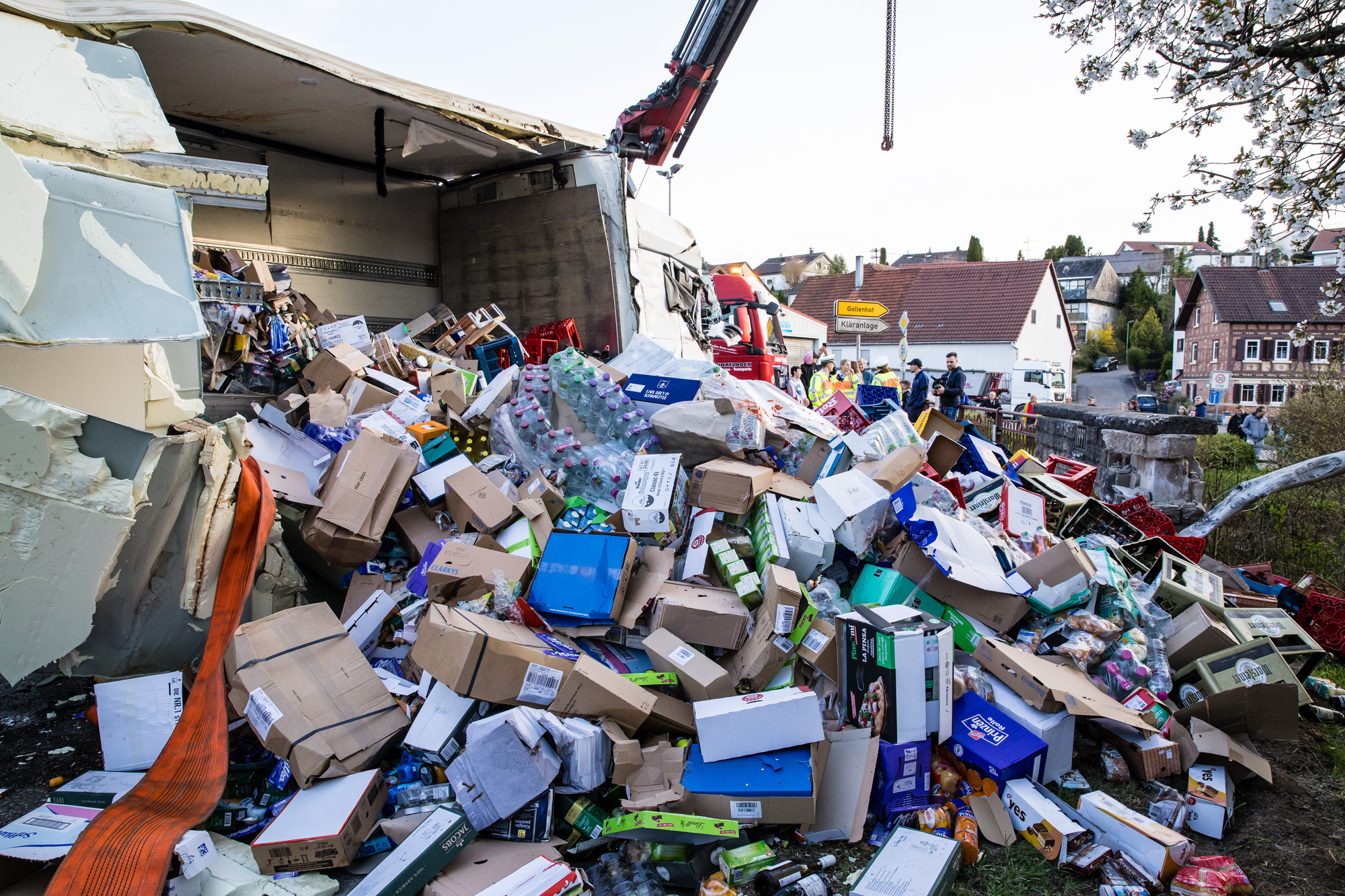 Leutenbach. So manchem Bier-, Limo- und Süßigkeitenfan dürfte am Dienstagabend in Weiler zum Stein das Herz geblutet haben: Liter-, beziehungsweise kiloweise lag das Material auf der Straße „In der Steige“ verteilt. Zuvor war dort ein Lkw umgekippt, die Straße im Anschluss für sieben Stunden gesperrt. Die gute Nachricht: Der Fahrer blieb unverletzt. Thomas Winkelhock, Inhaber der gleichnamigen Firma aus Waiblingen, die sich unter anderem um die Bergung solcher Fahrzeuge