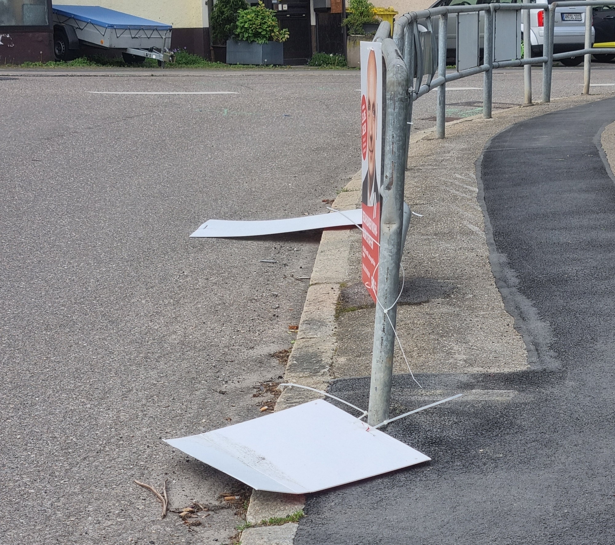 Gezieltes Foulspiel im politischen Wettbewerb oder (farben-)blinde Zerstörungswut? Nach den Grünen im Rems-Murr-Kreis schimpft jetzt auch die Leutenbacher SPD über den Umgang mit ihren Wahlplakaten zur Kommunalwahl im Juni. Wie der Ortsvereinsvorsitzende Pierre Orthen in einer Pressemitteilung berichtet (und per Foto belegt), sind mehrere Plakate der Genossen am Bahnhof in Nellmersbach heruntergerissen und kaputt gemacht worden. In Leutenbach wurde auch mindestens ein Grünen-Plakat zur