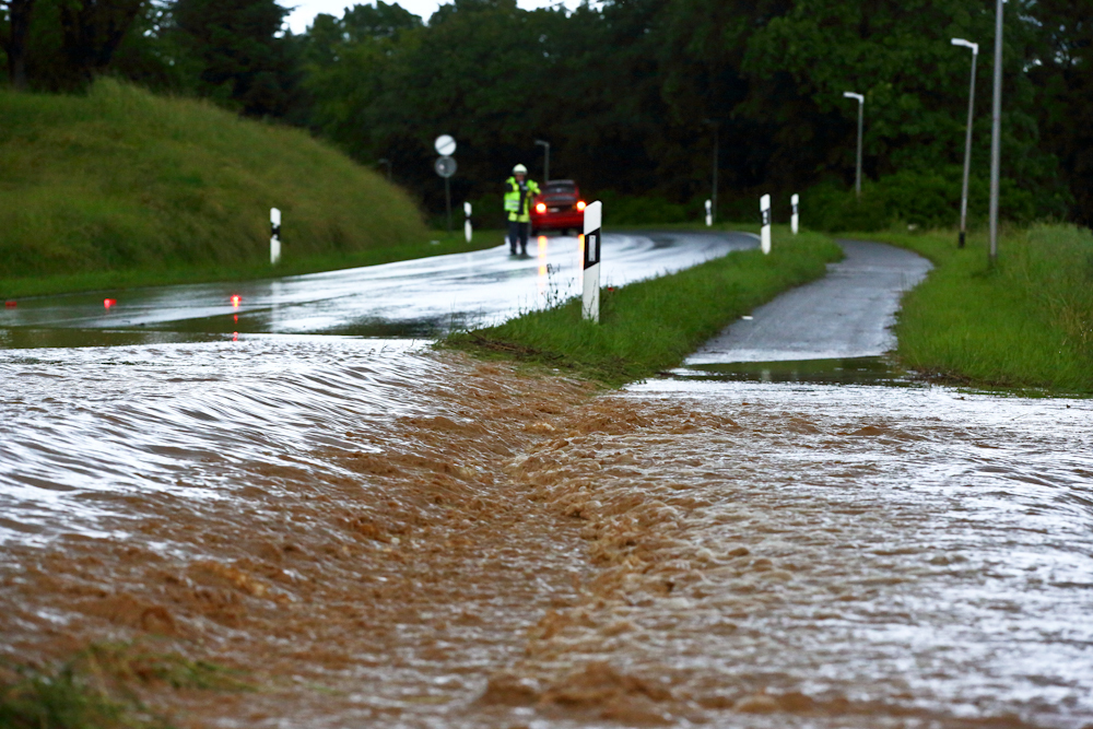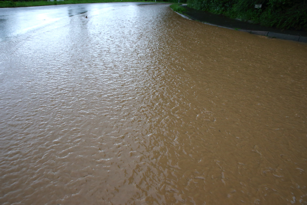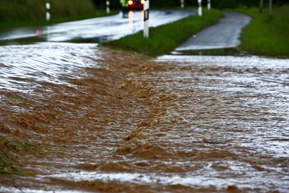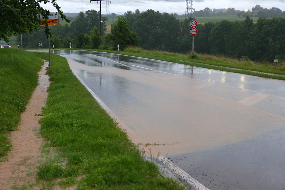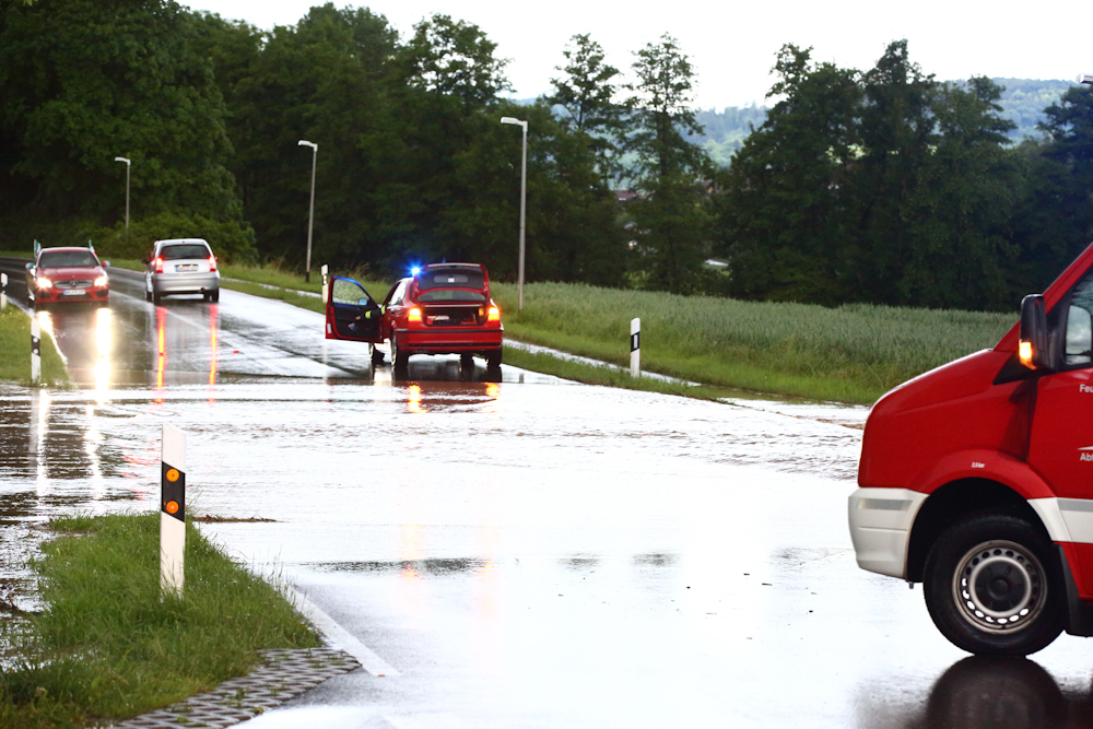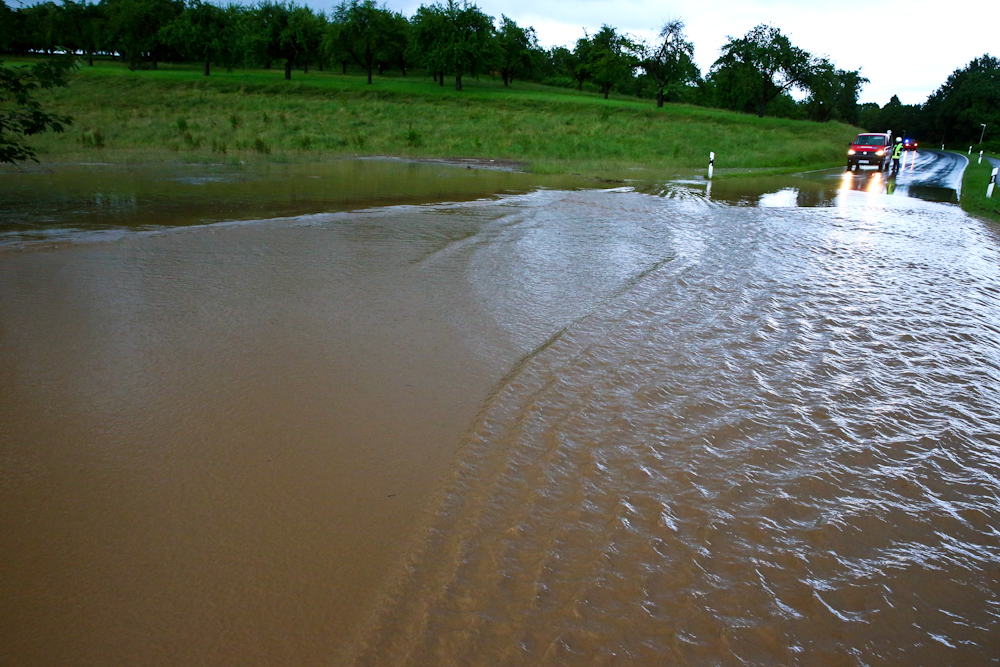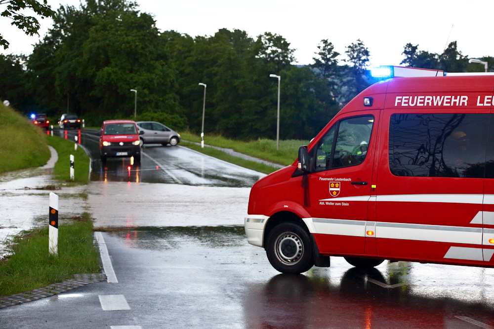 Leutenbach. Es regnet immer weiter. Allmählich haben auch Felder und Wiesen genug, nehmen die Wassermassen nicht mehr auf, schicken sie auf angrenzende Straßen. Deren Asphalt ist nicht wasserdurchlässig, damit bekommt die Feuerwehr zu tun – wie am Dienstagabend vor allem auf der Kreisstraße von Leutenbach nach Weiler zum Stein.
