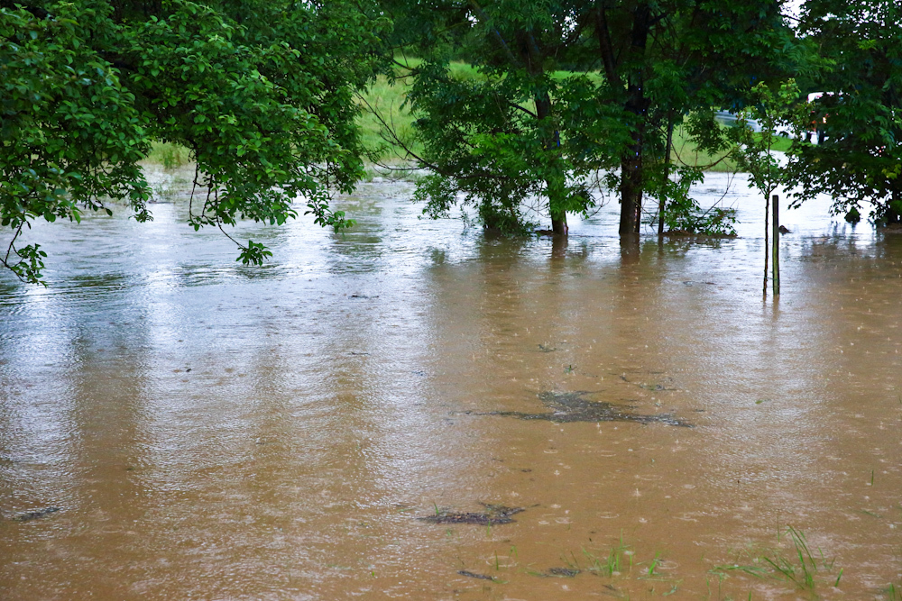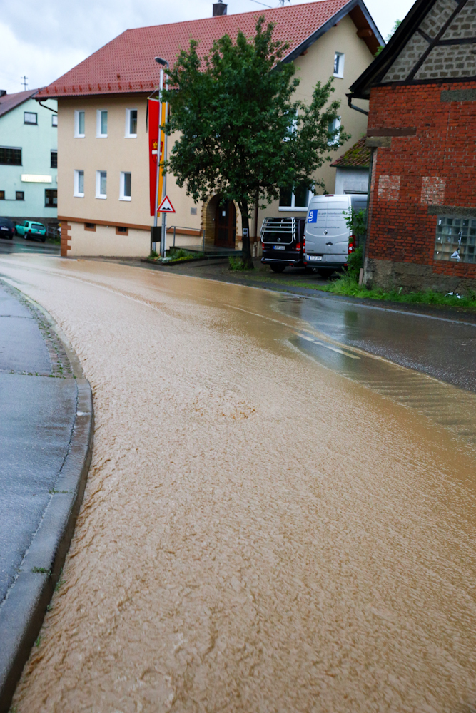 Der Buchenbach sei bislang nicht das Problem, so Feuerwehrkommandant Jochen Weller, für Überflutungen sorge das (zu) viele Oberflächenwasser in Folge des anhaltenden Regens. So hätten seine Leute deswegen am Dienstag auch in allen drei Teilorten Keller leerpumpen müssen. Aus seiner Sicht sei die Lage nach wie vor angespannt, Wiederholungen nicht ausgeschlossen. Weller berichtet, dass ein Landwirt gemessen hat, dass im betreffenden Zeitraum innerhalb von zehn Minuten über 25 Liter Regen auf den Quadratmeter fielen. Es sei klar, dass vor allem an den Ortseingängen, an den Übergängen zu den landwirtschaftlichen Flächen, die Kanalisation das nicht mehr verarbeiten könne.