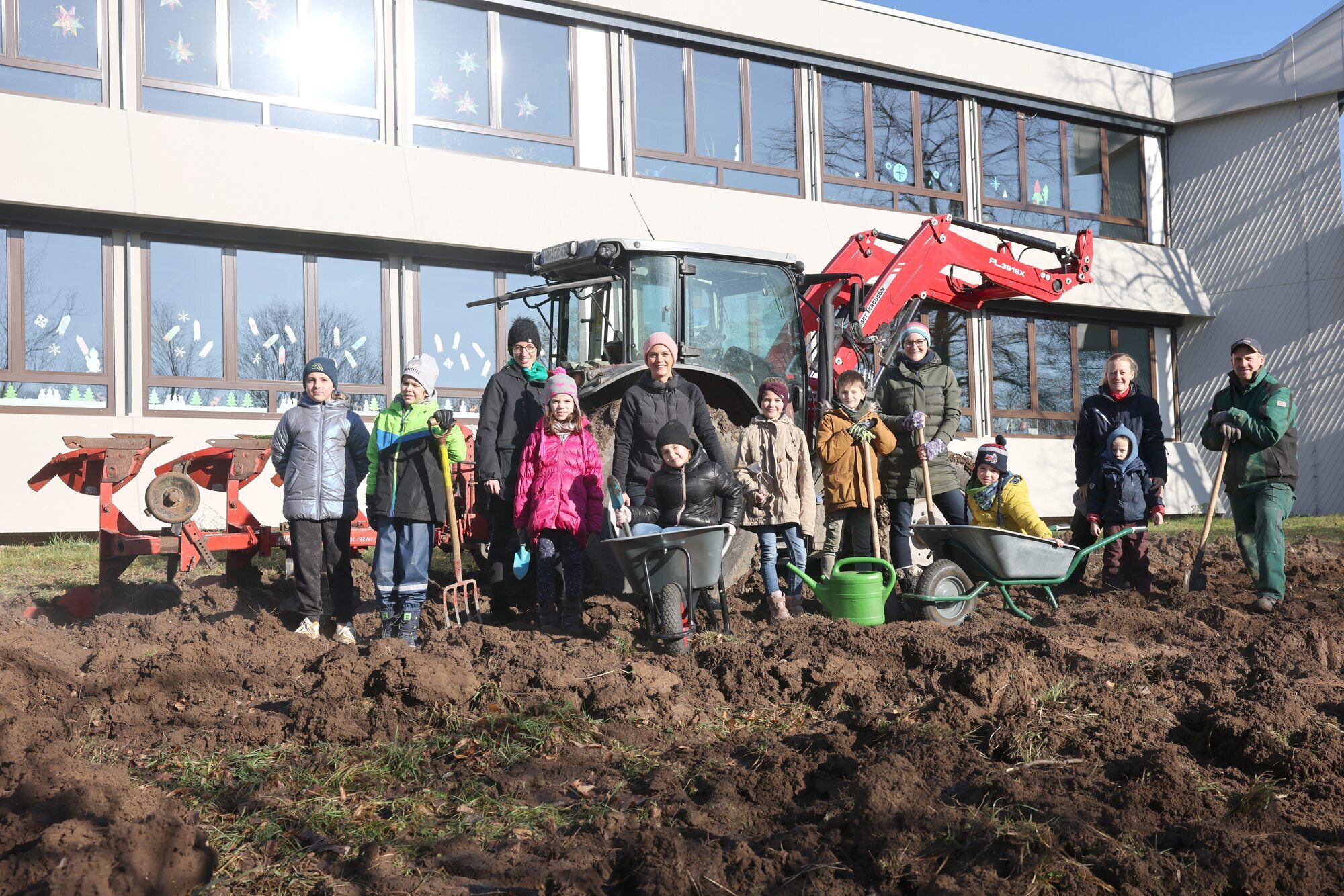 Das abgesteckte Areal umzupflügen ging schneller als gedacht. Was so ein Schlepper mit Pfluganhänger zu leisten imstande ist, da staunten Konrektorin Claudia Fischer und Lehrerin Stefanie Kohl nicht schlecht. „Das ging dann doch ratzfatz“, freut sich Fischer und guckt strahlend zum satt matschbraunen Acker, der noch vor kurzem eine grüne Wiese hinter dem Schulgebäude der Hohbergschule Plüderhausen war. Hier sollen die Grundschülerinnen und Grundschüler bald ihr eigenes Gemüse anpflanzen,