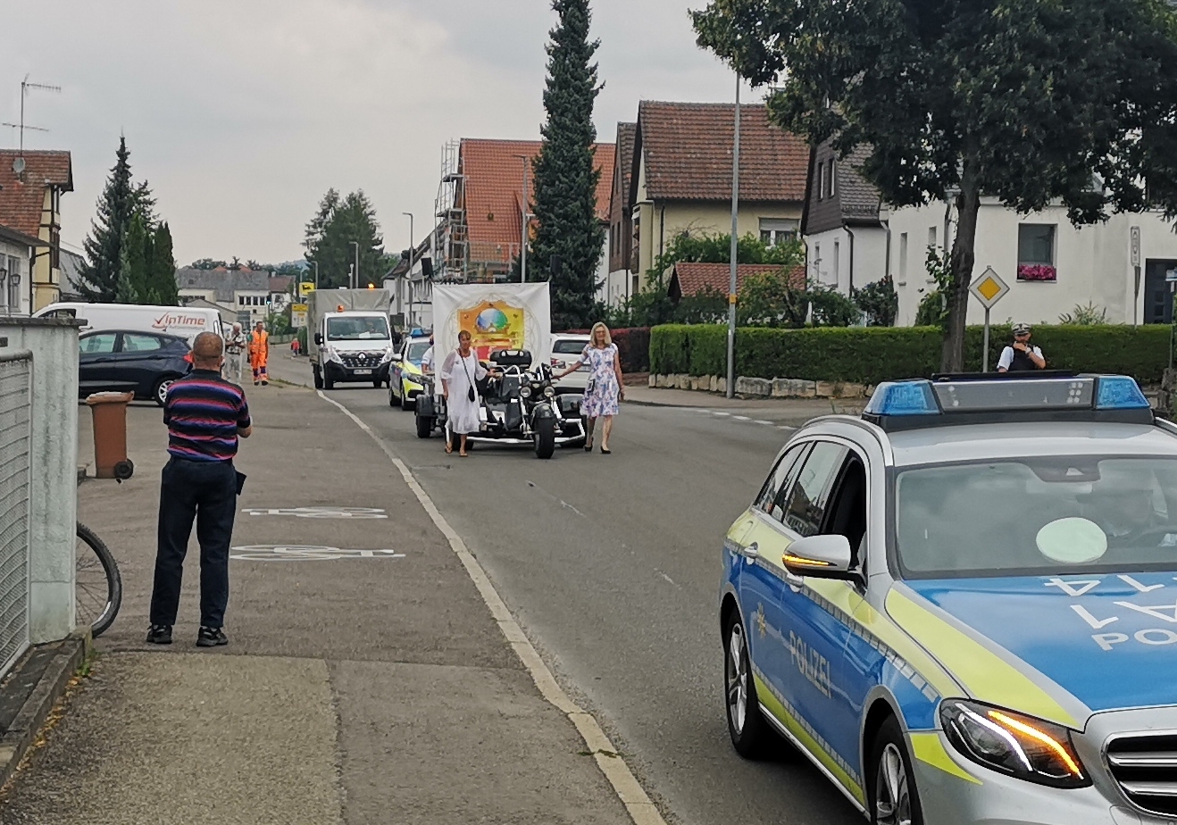 Es ist ein seltsamer Zug, der am Sonntag mit Blaulichteskorte durch Plüderhausen schleicht: ein dreirädriges Motorrad mit Anhänger, das vorne von zwei Damen gezogen, hinten von zwei weiteren und einem Herrn geschoben wird. Und Thomas Hornauer im knallbunten Batik-Shirt, der das Gefährt umkreist und mit dem Handy filmt. Vorne und hinten ist der „Aufzug zum königlichen Hof“, wie das Ganze angekündigt ist, von einem Polizeiauto begleitet. Die Polizisten und eine Mitarbeiterin des