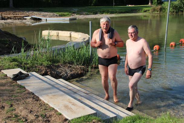- Fritz Knopp und Rolf Weller sind ganz treue Badegäste. Manchmal bereits im April steigen sie in den See und tun das bis zum Herbst. Fritz Knopp fand den See auch schon vor den Verbesserungen wunderschön. Rolf Weller ist Mitglied im Gartenschau-Arbeitskreis Badesee und engagiert sich vielfältig am See. Er findet die Erweiterung der Liegefläche und die Verlegung des DLRG-Bereichs gut. Er bemängelt, dass zwei Einstiege in den See verschlammt sind.