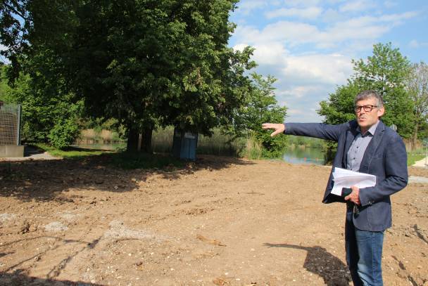 Die Arbeiten für die Verschönerung des Badesees haben im November begonnen. Im Winter musste eine längere Pause eingelegt werden. „Es war lang zu kalt.“ Und in den vergangenen Wochen zu nass. In dieser Woche wird der Untergrund bearbeitet und planiert, in der nächsten Woche wird Rollrasen gelegt.