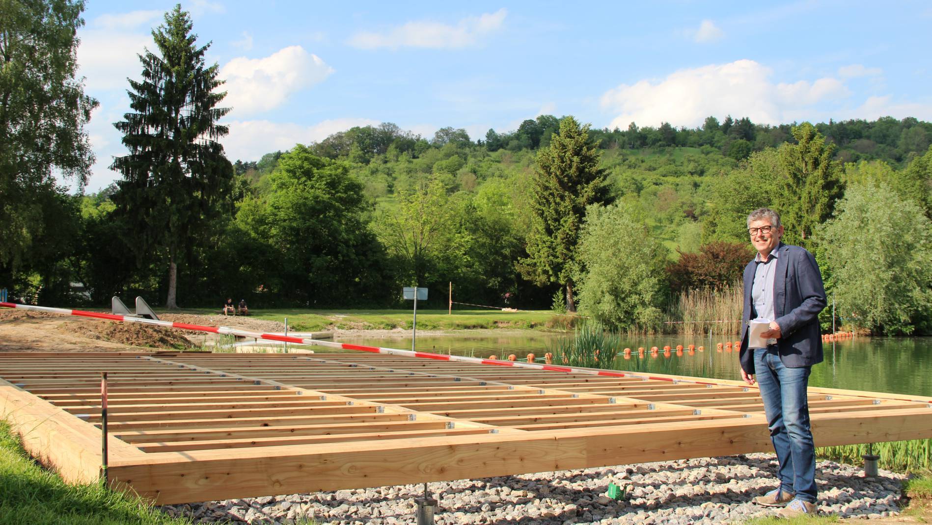Links und rechts des Podests führen jetzt steinerne Stufen ins Wasser. Jeder Einstieg soll noch einen Handlauf bekommen, verspricht Bürgermeister Andreas Schaffer. Er weiß, dass sich an den neuen Treppen bereits Kritik entzündet hat. Denn bisher geht der Badegast treppab in schlammigen Untergrund. „Da müssen wir nacharbeiten.“ Grundsätzlich gibt der Bürgermeister zu bedenken, dass der Badesee noch eine Baustelle ist. „Wir sind noch nicht fertig.“