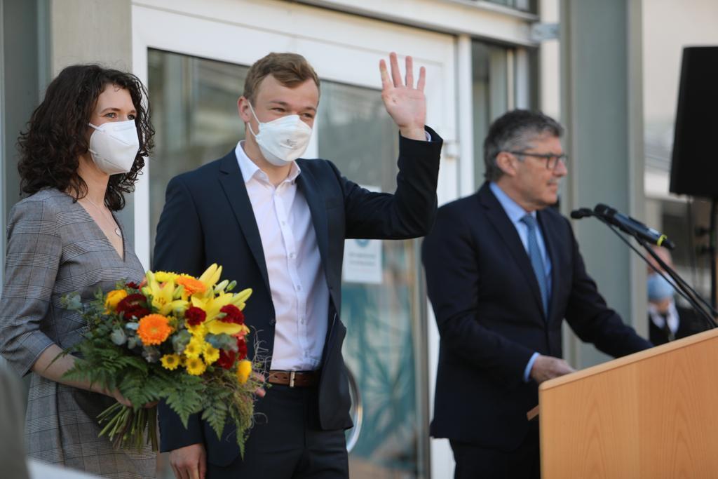 Benjamin Treiber steht nun auf der Treppe vor der Staufenhalle und zeigt sich "sprachlos" über das klare Ergebnis. "Gemeinsam mit Ihnen möchte ich die Zukunft der Gemeinde gestalten", sagt Treiber. "Wir freuen uns sehr auf Plüderhausen als unsere neue Heimat."