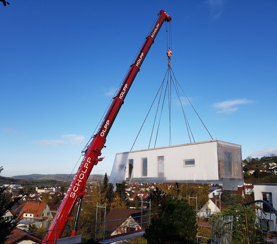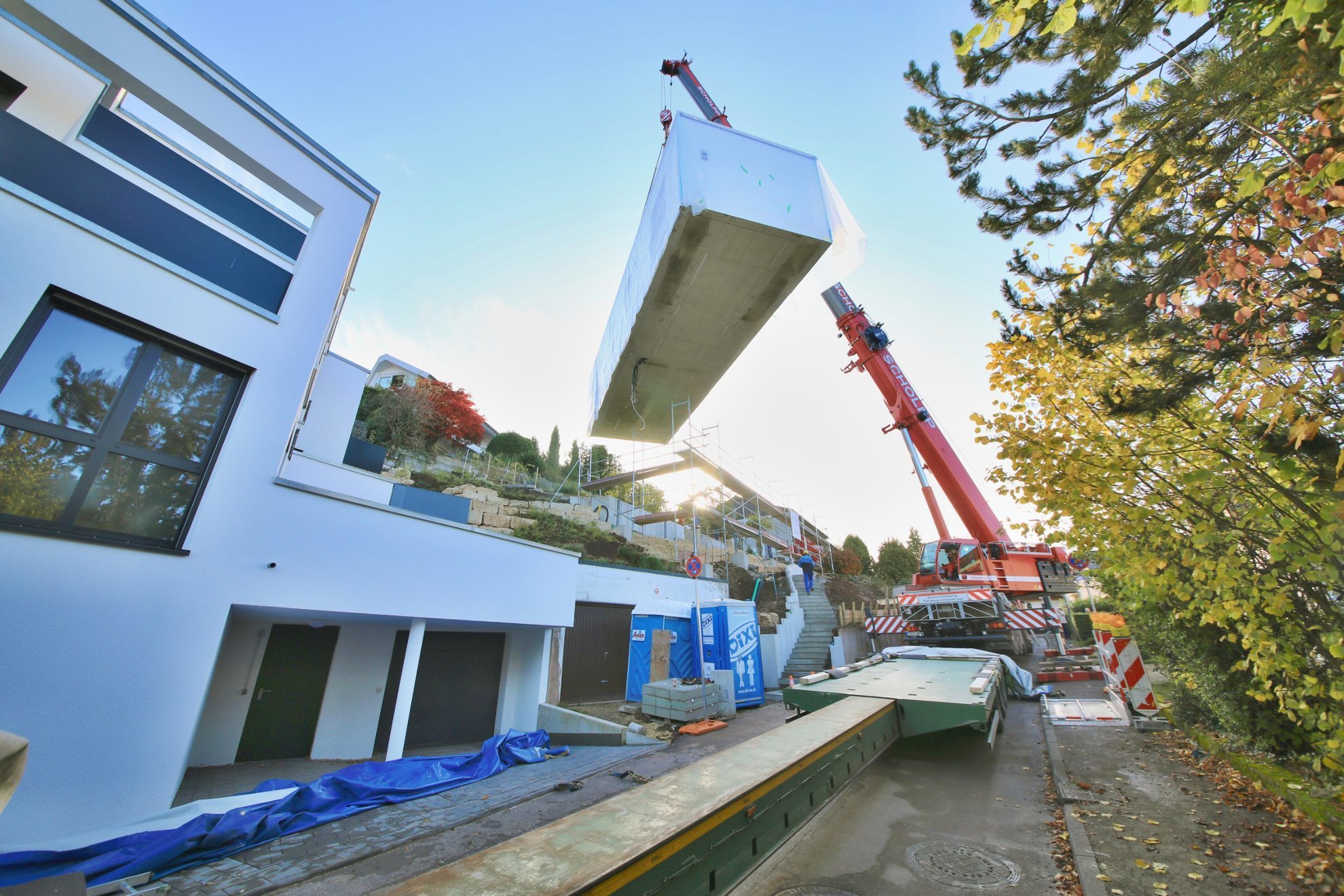 Als der Kran dazu ansetzt, das 21 Tonnen schwere Haus in den Hang zu heben, ist die ganze Nachbarschaft versammelt. Spektakulär ist es eben