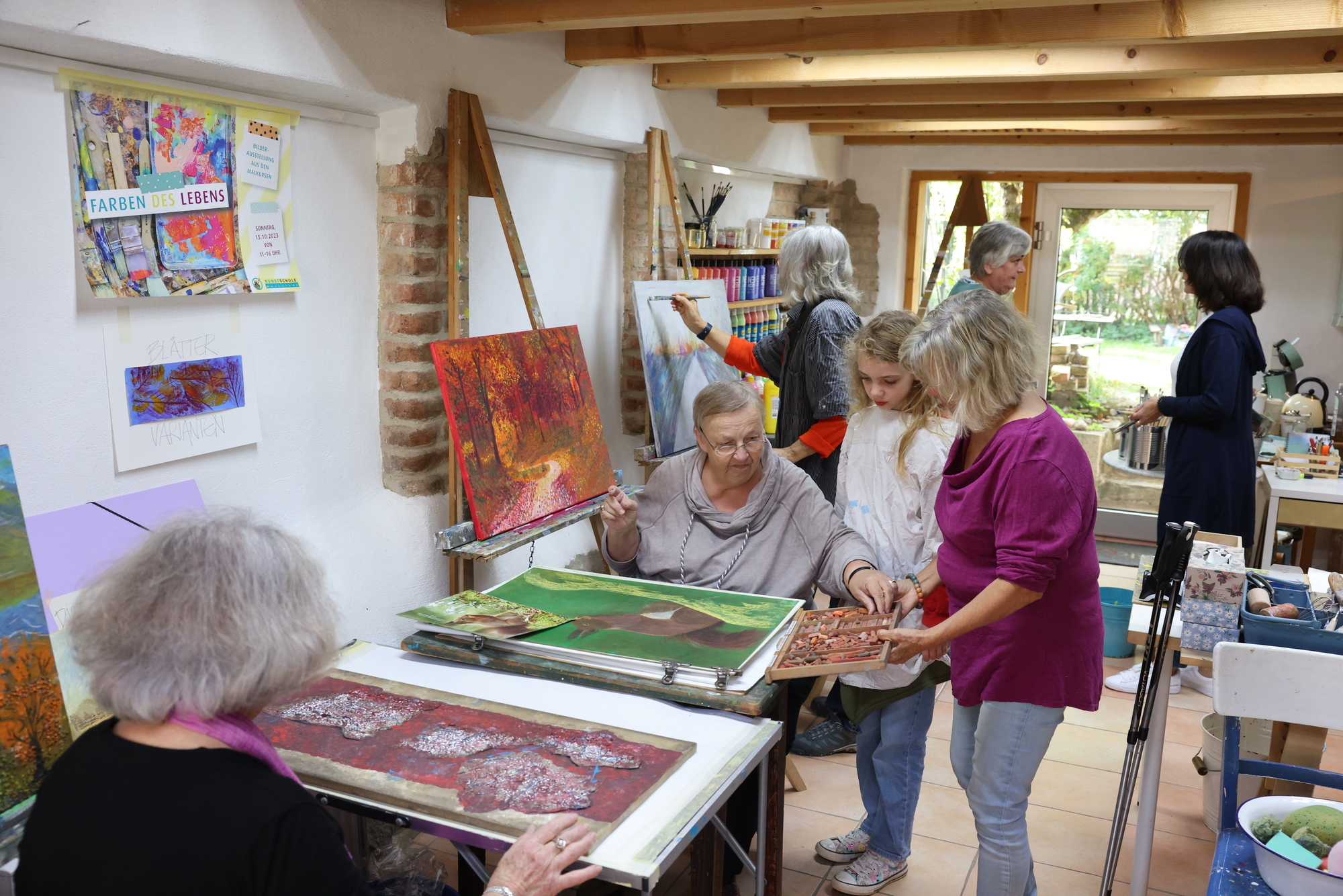 Was auch immer man erwartet, wenn man eine Malwerkstatt betritt – vermutlich nicht, dass alles säuberlich aufgeräumt ist: Jeder Pinsel, jeder Lappen, jeder Radiergummi, jede Leinwand hat einen Platz. Und es herrscht zufriedene Ruhe in der Kunstschule Weitsicht in Plüderhausen. Allerdings konzentriert arbeitend, denn hier sitzen und stehen sechs Künstlerinnen vor ihren aktuellen Werken, die teilweise am Wochenende in einer Ausstellung präsentiert werden.