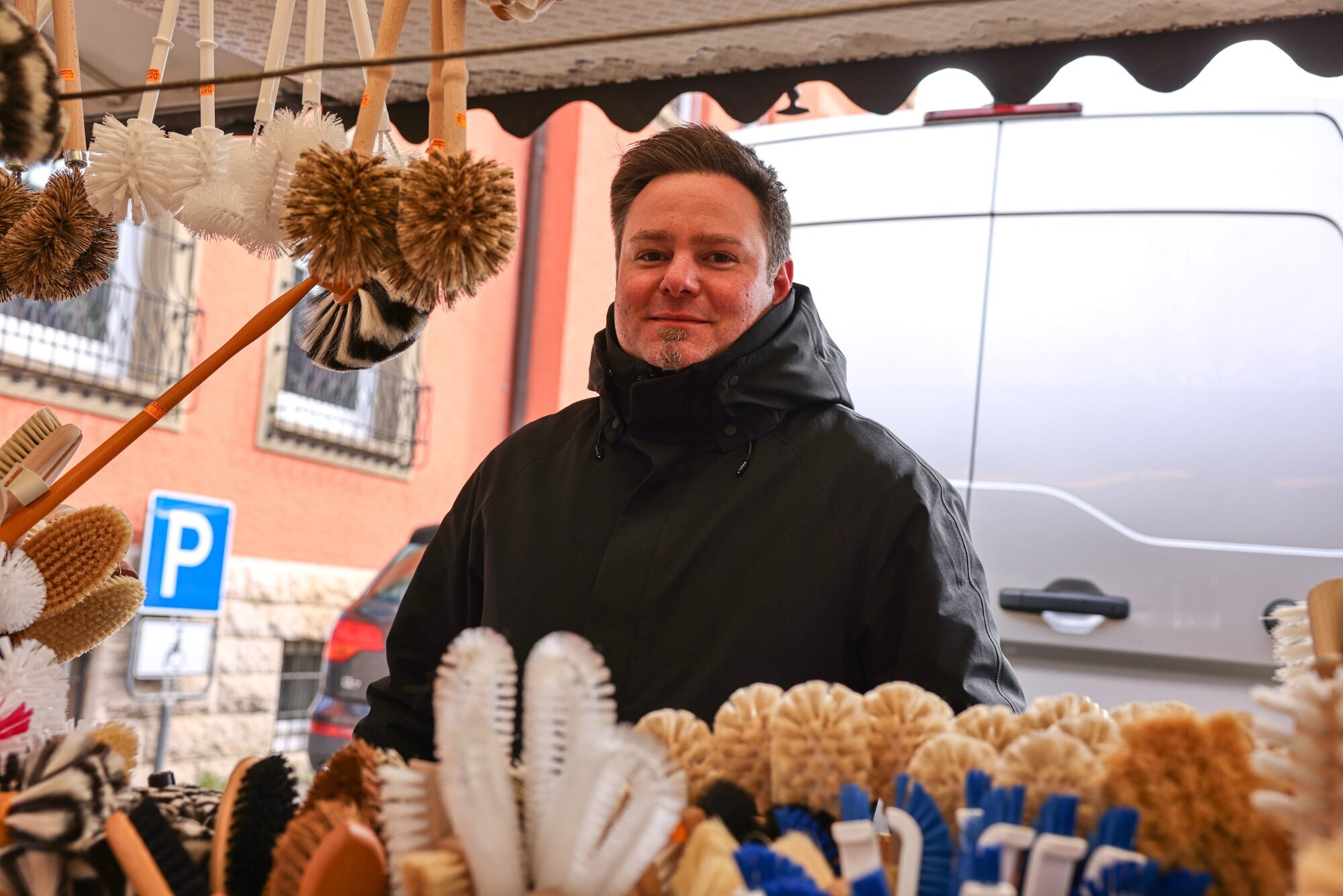 Am frühen Morgen ist noch wenig los, der Wind pfeift kalt über den Marktplatz. Sathya Geiger schaut besorgt zum