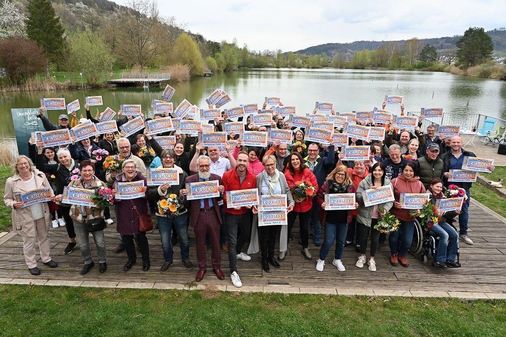 Insgesamt 119 Plüderhäuserinnen und Plüderhäuser dürfen sich freuen. Sie teilen sich den Gewinn von 1,4 Millionen Euro. Denn das Losglück bei der Deutschen Postcode-Lotterie ereilte in diesem Monat die Postleitzahl 73655. Am Plüderhäuser See haben sie das gemeinsam gefeiert. Dort erhielt die Tafel Baden-Württemberg zudem noch einen Scheck in Höhe von 300.000 Euro.