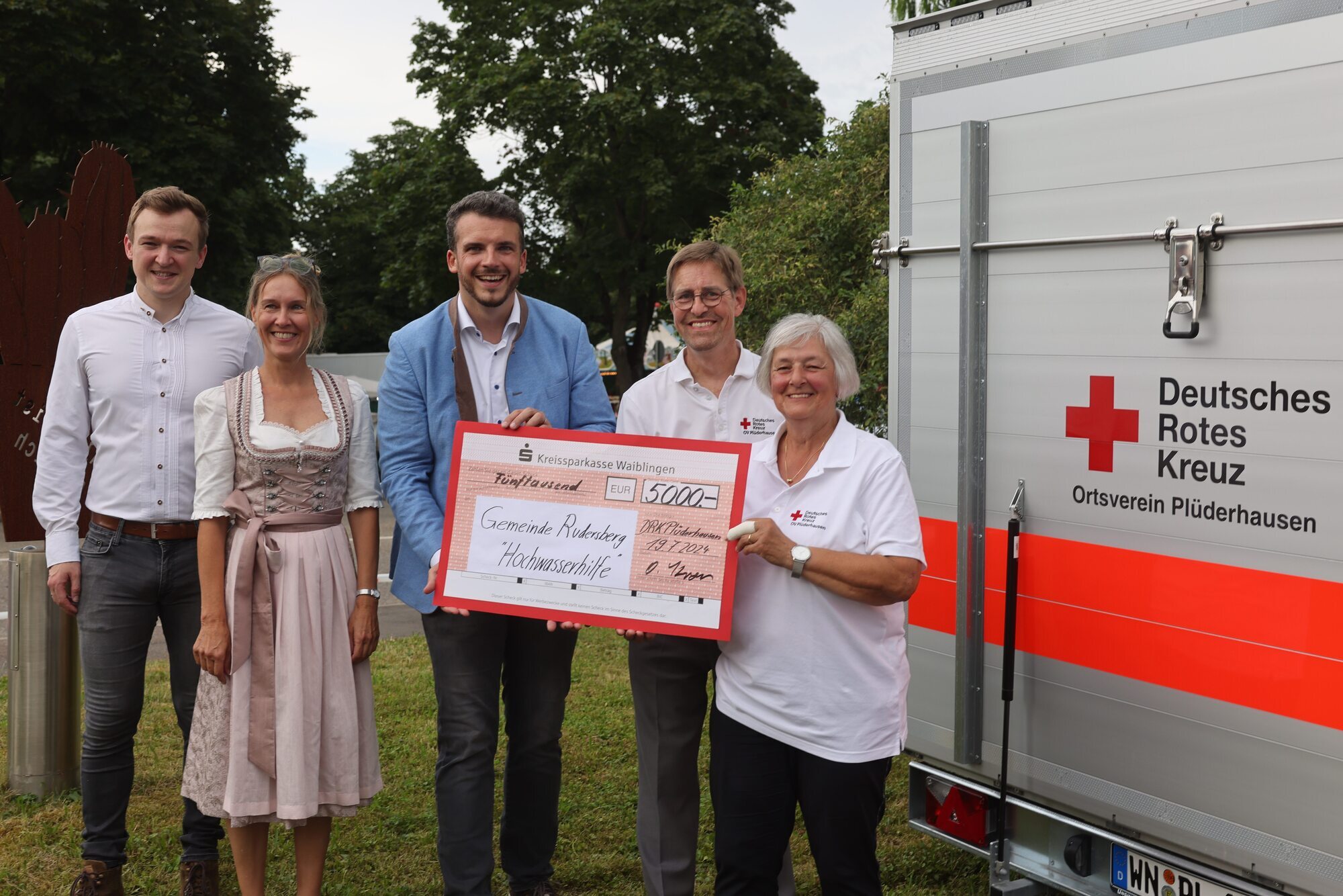 Das Deutsche Rote Kreuz (DRK) Plüderhausen hat am Rande der Plüderhäuser Festtage einen Scheck über 5000 Euro an den Rudersberger Bürgermeister Raimon Ahrens übergeben. Noch unter dem ersten Schock über die Hochwasserverwüstungen in Rudersberg hatte man sich im DRK-Ortsverband kurzfristig entschlossen, die Gemeinde an der Wieslauf zu unterstützen. Innerhalb von drei Tagen habe man, so erzählt es Plüderhausens Bürgermeister und Erster Vorsitzender des DRK, Benjamin Treiber, eine Hocketse auf