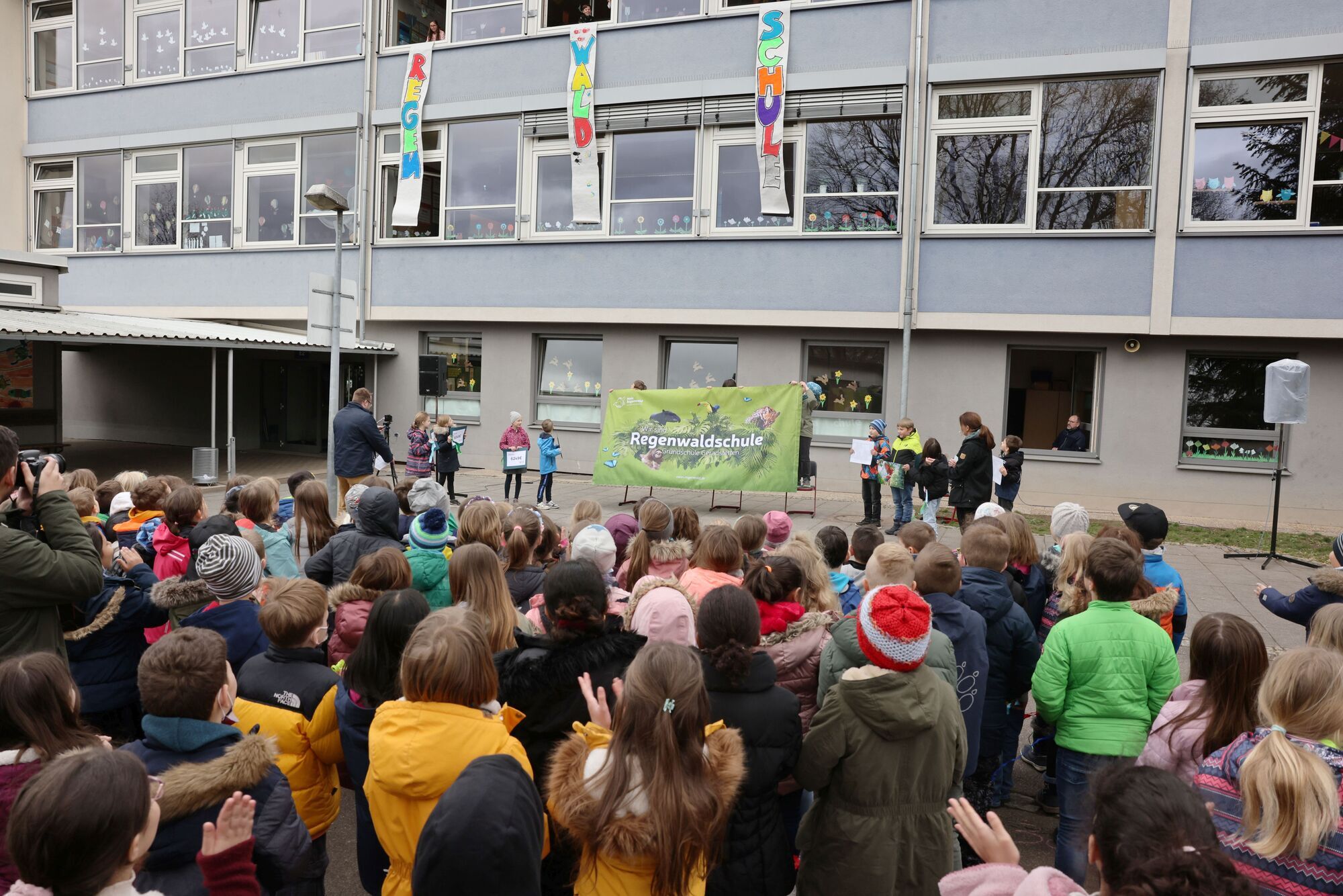 Mit großem Jubel und einem fröhlichen Tier-Tanz haben die Schülerinnen und Schüler der Grundschule Geradstetten ihren neuen Status als „Regenwaldschule“ gefeiert und ein Banner enthüllt.