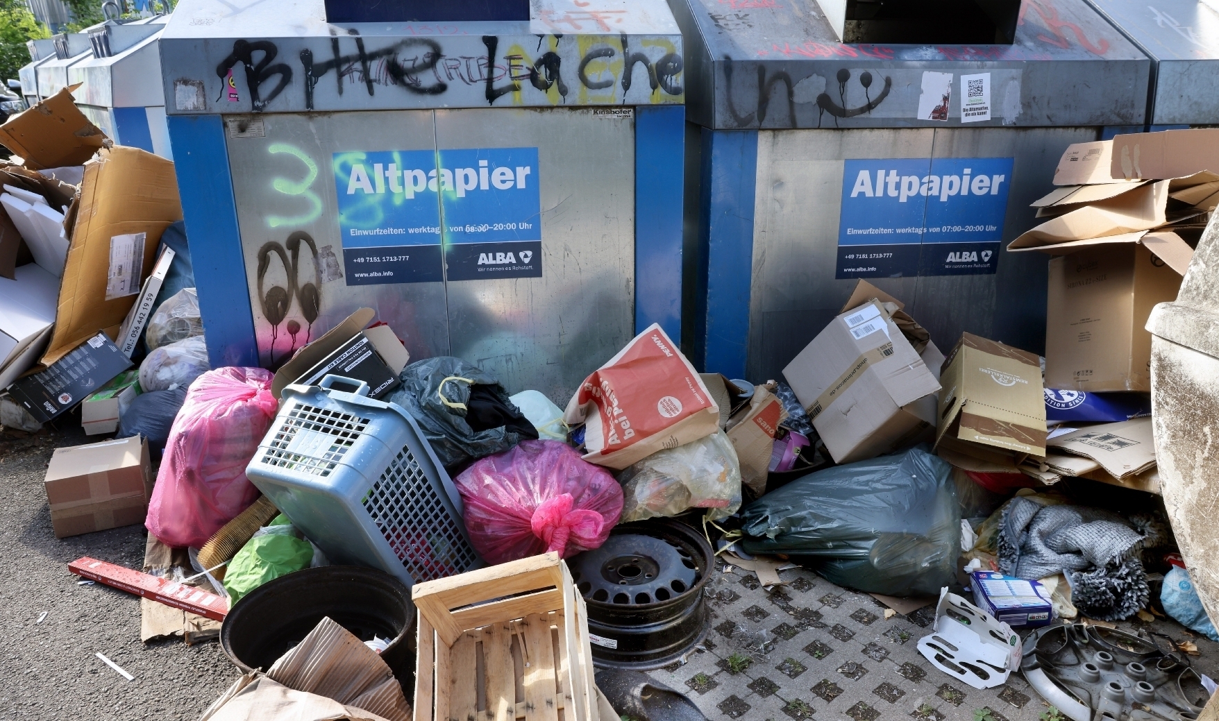Einmal mehr haben Unbekannte den Platz rund um den Müllcontainer an der Alfred-Klingele-Straße am Parkplatz gegenüber der Arnold-Glaswerke verschmutzt und wild ihren Müll abgeladen. Bilder, Wäschekörbe, Verpackungsmaterial, ein Pantoffel für den rechten Fuß, Mülltüten, Nagetierkäfig, Holzkisten - sogar gammeliges Brot waren da zu finden.