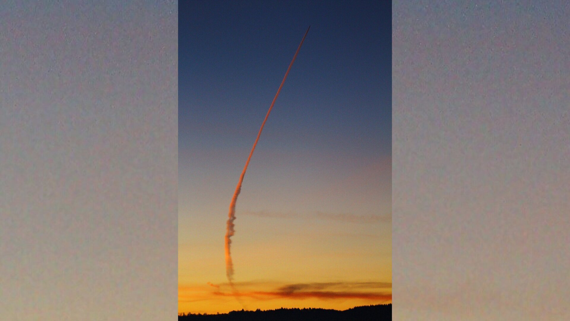 Ein Kondensstreifen steigt beinahe senkrecht in den Himmel hinauf. Zwischen