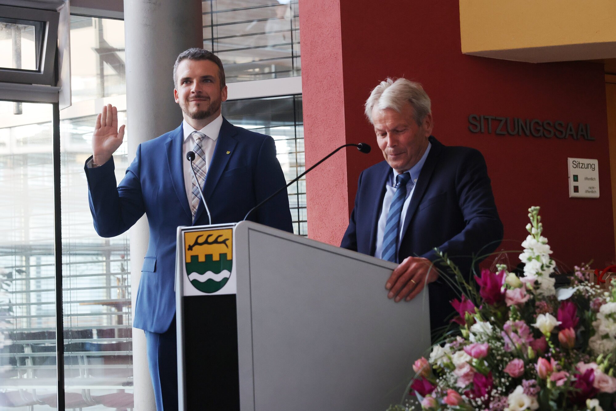 Rudersberg. Wiedergewählt wurde Raimon Ahrens bereits im Januar, nun tritt er auch offiziell seine zweite Amtszeit an. Dafür gab es am Donnerstagabend (16.04.) viele Worte des Lobes, ein neues VfB-Trikot für den Rudersberger Schultes und Vorschusslorbeeren für die kommenden acht Jahre.