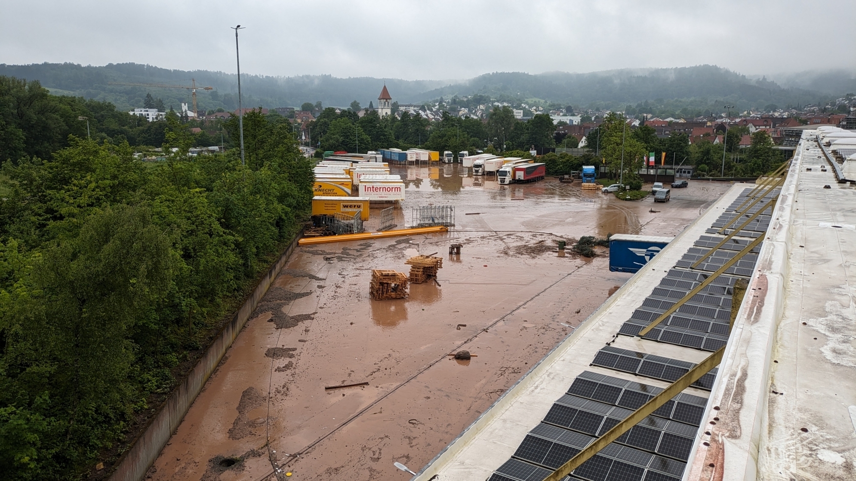 Das Gelände und die weitläufigen Hallen der Wiedmann Unternehmensgruppe in Rudersberg mit den dort angesiedelten Logistikunternehmen Spedition Knecht, Mundinger Transport und Spedition Wiedmann wurden erheblich durch die Wassermassen der Nacht zum vergangenen Montag in Mitleidenschaft gezogen. Über 1,50 Meter stieg das Wasser in den Lagerhallen und zerstörte die dort gelagerten Güter, so schreibt das Unternehmen am Montag, 10. Juni, in einer Pressemitteilung.