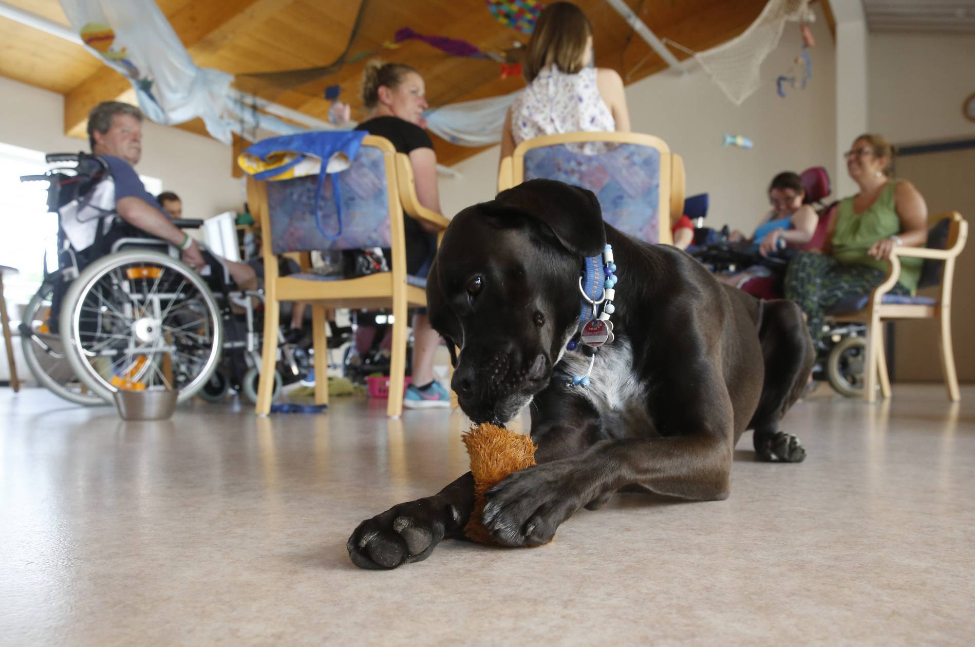 Solche Spiele fördern nicht nur die Hündin, sondern auch die Motorik der Menschen. „Wir wollen geistige, emotionale und motorische Kompetenzen fördern“, erklärt die Leiterin Sandra Eckert. In der Tagesförderstätte werden nicht nur die Grundbedürfnisse der Männer und Frauen versorgt. Oft machen sie Ausflüge, Spaziergänge und spielen Spiele. „Das ist auch eine Pflege für die Seele“, sagt Eckert. Es ist ihr wichtig, dass die Menschen lernen, sich selbst zu helfen. Sie sollen so selbstständig wie möglich werden. Das Ziel der Pfleger sei es, sich selbst überflüssig zu machen. Emma ist für Eckert wie eine zusätzliche Mitarbeiterin, denn sie hilft ihr dabei, diese Aufgabe zu erfüllen. „Es ist toll für die Leute, sich um ein Lebewesen zu kümmern“, sagt Isabelle Kolb, „dadurch lernen sie, Verantwortung zu übernehmen.“