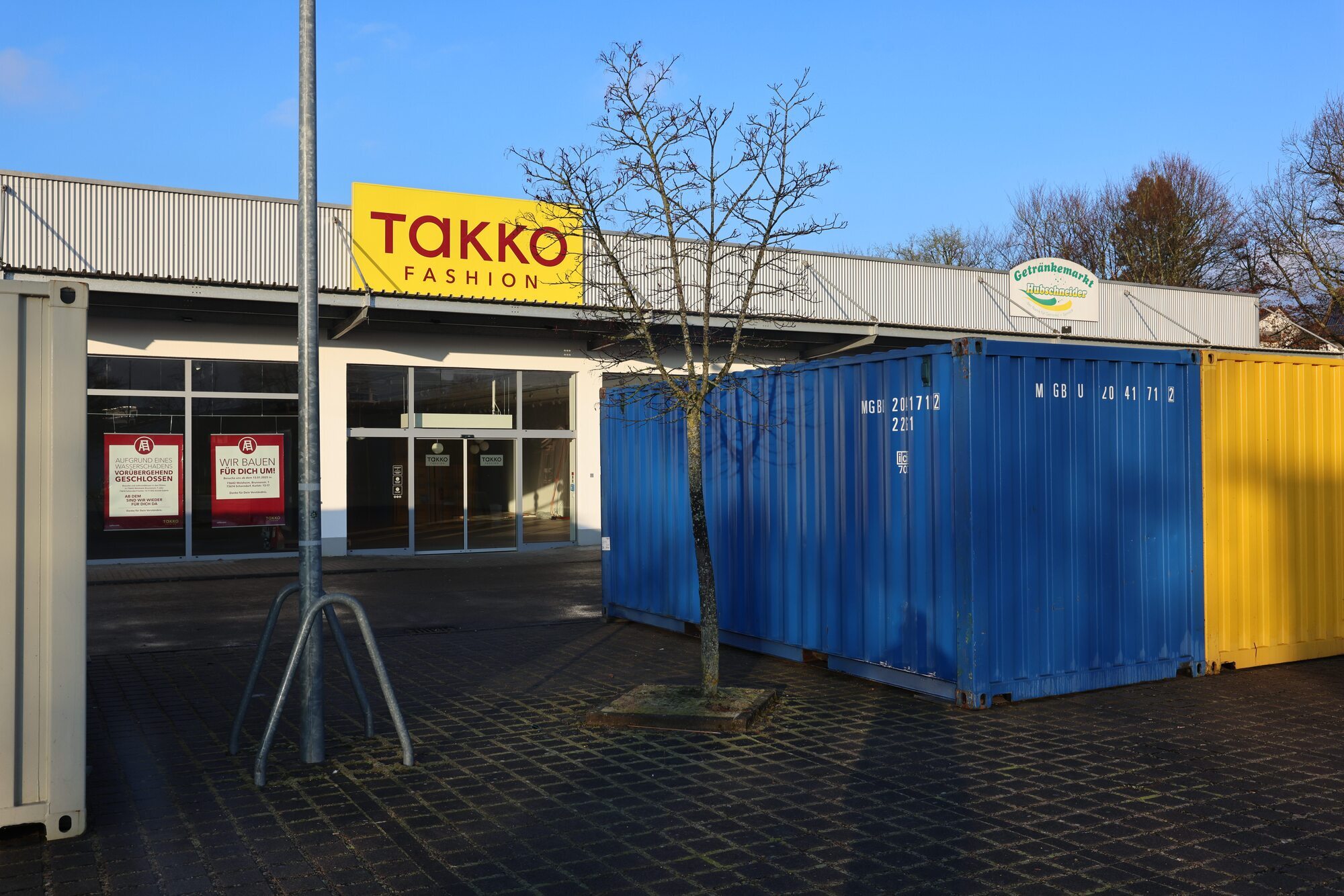 Unbeschriftete Container, die seit einigen Tagen auf dem Parkplatz Am Burren stehen, sorgten in der Rudersberger Bürgerschaft für Verwunderung. Was haben die dort zu suchen? Die Auflösung kam dann kurz darauf – und prangt nun gut sichtbar an der Filiale der Textilkette Takko: Eine Ladenschließung ist der Grund.