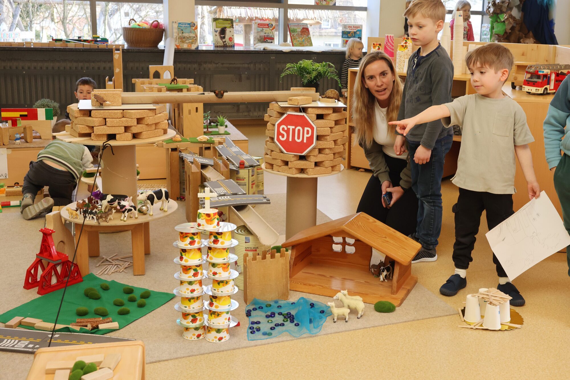 Ein halbes Dutzend Kinder steht im Eingangsbereich der Kita Pusteblume und überlegt. Soll es heute in den Bau- und Konstruktionsraum gehen? Oder