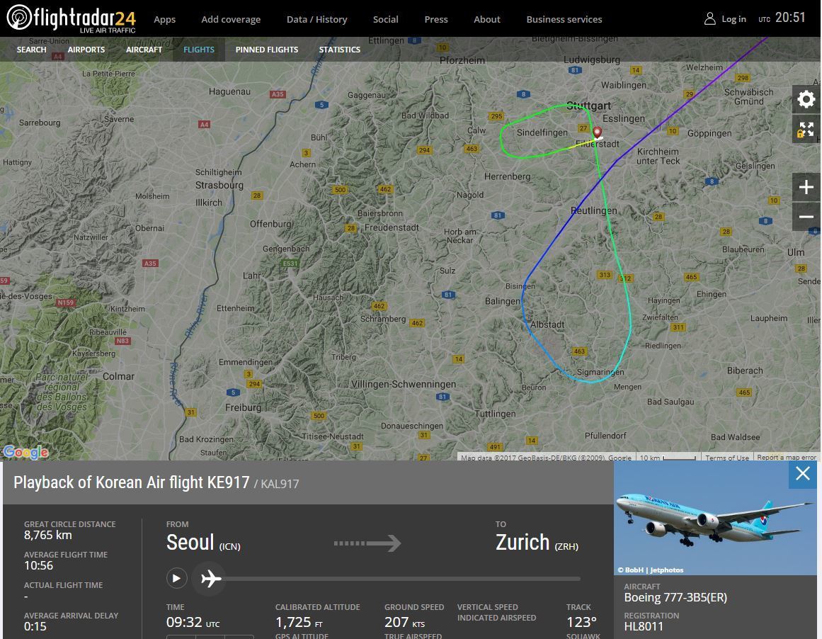 Vermutlich handelte es bei der Passagiermaschine um den Flug Nummer KE917 der Korean Air aus Soul, unterwegs in Richtung Zürich. Auf der App Flightradar24 war der Flug als "diverted to STR" gekennzeichnet, also umgeleitet nach Stuttgart. Die Flugroute ist ebenfalls zu sehen, wobei die Maschine einen großen Schwenker von der eigentlichen Flugroute ab Balingen wieder nach Norden Richtung Stuttgart und eine Schleife zum Flughafen macht.