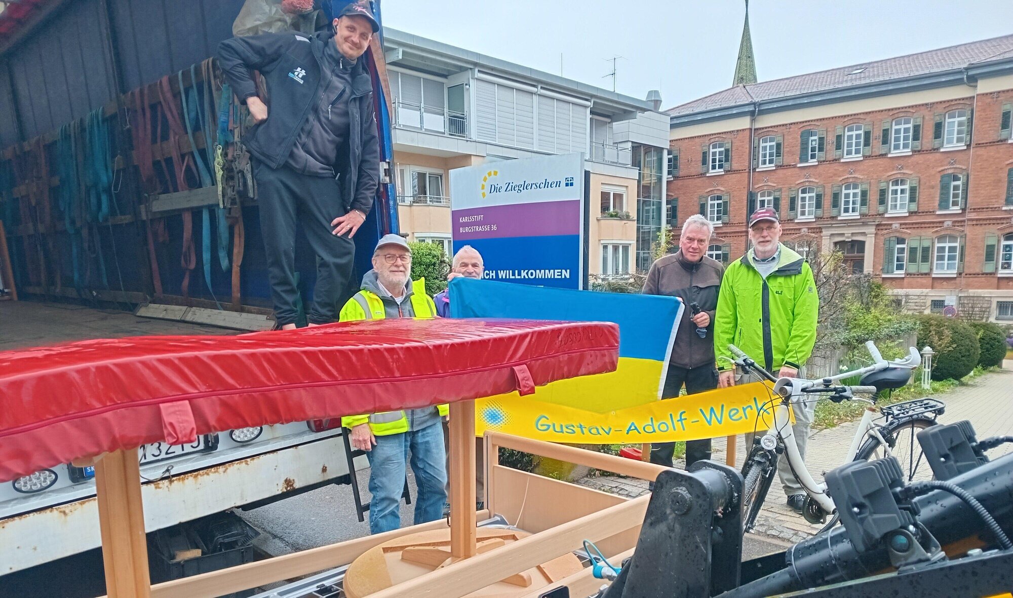 Schorndorf. Fast 80 Transporte mit Schulmöbeln, Bettwäsche, Fahrrädern und Pflegebetten sind seit Kriegsbeginn im Februar 2022 schon in die Ukraine gegangen. Im „Connect“, dem Begegnungszentrum der SV Schorndorf in der Gmünder Straße, hat das landeskirchliche Gustav-Adolf-Hilfswerk eine Sammelstelle für gebrauchte Gehstützen, Rollstühle und Rollatoren eingerichtet. Jetzt hat ein 40-Tonner Halt am Karlsstift gemacht, um sieben ausrangierte, elektrisch verstellbare