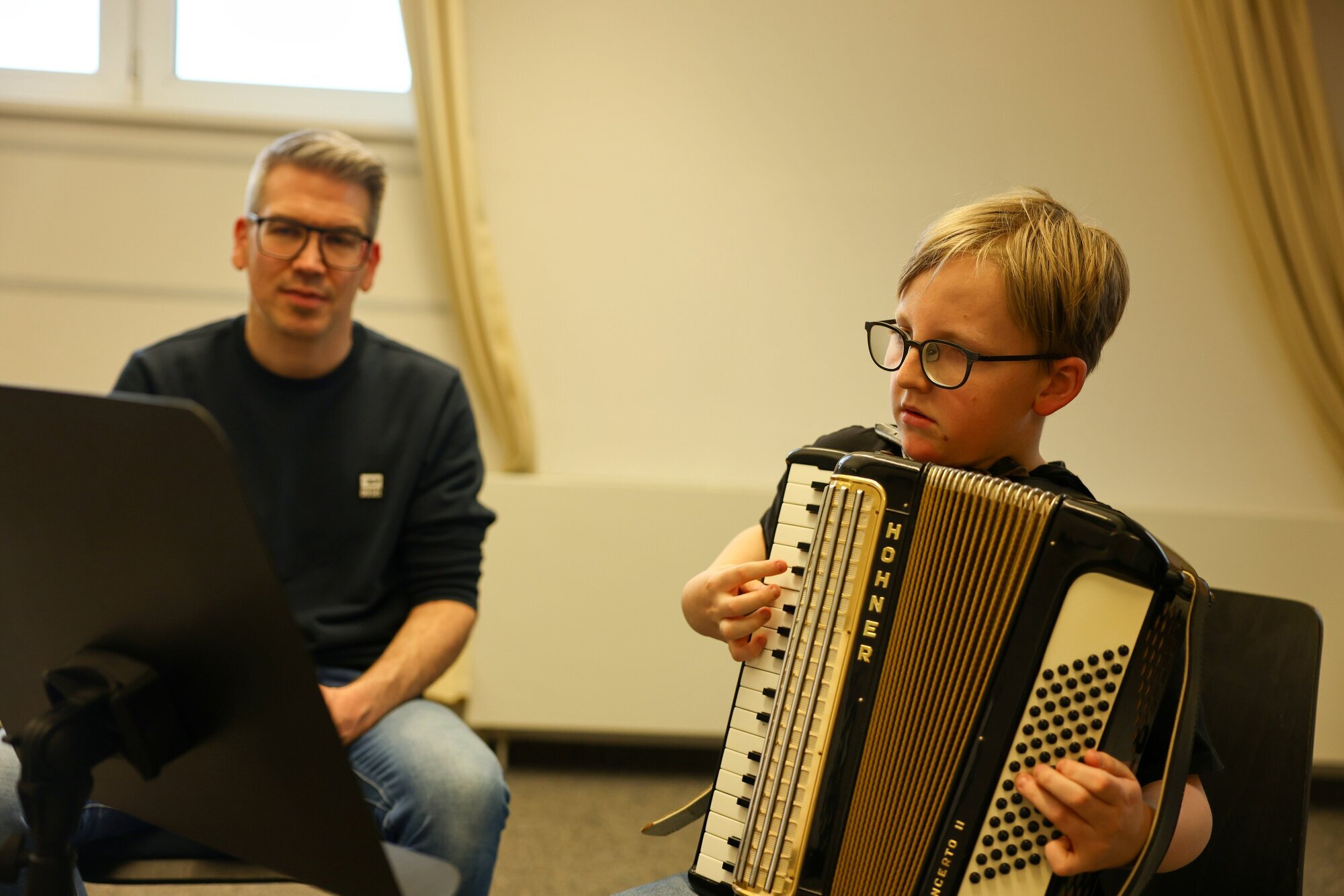 Schorndorf. Emil sitzt aufrecht auf der Kante seines Stuhls, sein Akkordeon liegt nah an seinem Oberkörper. Konzentriert schaut er in sein Notenheft, spielt mit seiner rechten Hand die Tasten, mit der linken Hand drückt er die Knöpfe. Der Zwölfjährige ist einer von vier Musik-Schülerinnen und -Schülern, die sich an der Jugendmusikschule Schorndorf und Umgebung dazu entschieden haben, Akkordeon zu lernen. Besonders viele sind das nicht, trotzdem hat das Akkordeon an
