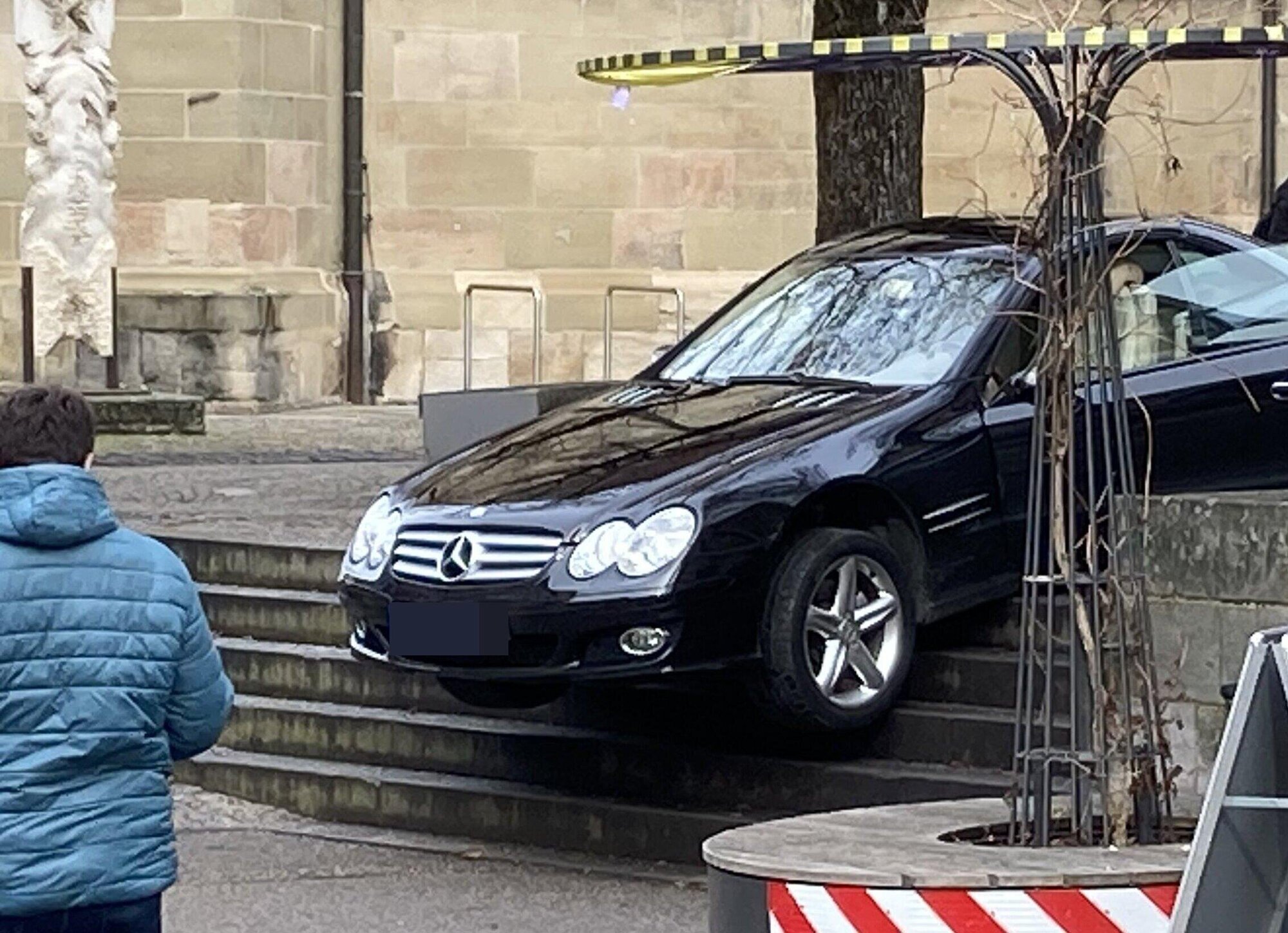 Schorndorf. Aufregung zur Mittagsstunde: Mehrere Anrufer haben der Redaktion am Mittwochmittag (04.02.) einen kuriosen Anblick geschildert. Ein Mercedes sei an der Treppe in der Nähe der Schorndorfer Stadtkirche hängen geblieben. Um diese Nachricht bestätigen zu können, haben wir uns ein Bild vor Ort gemacht. Was war da los?