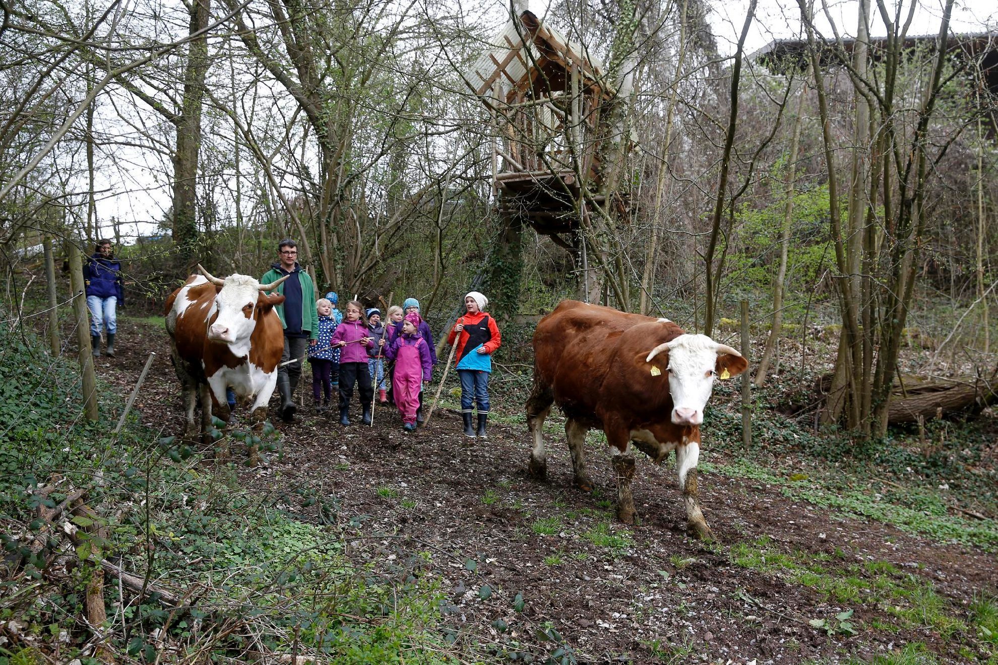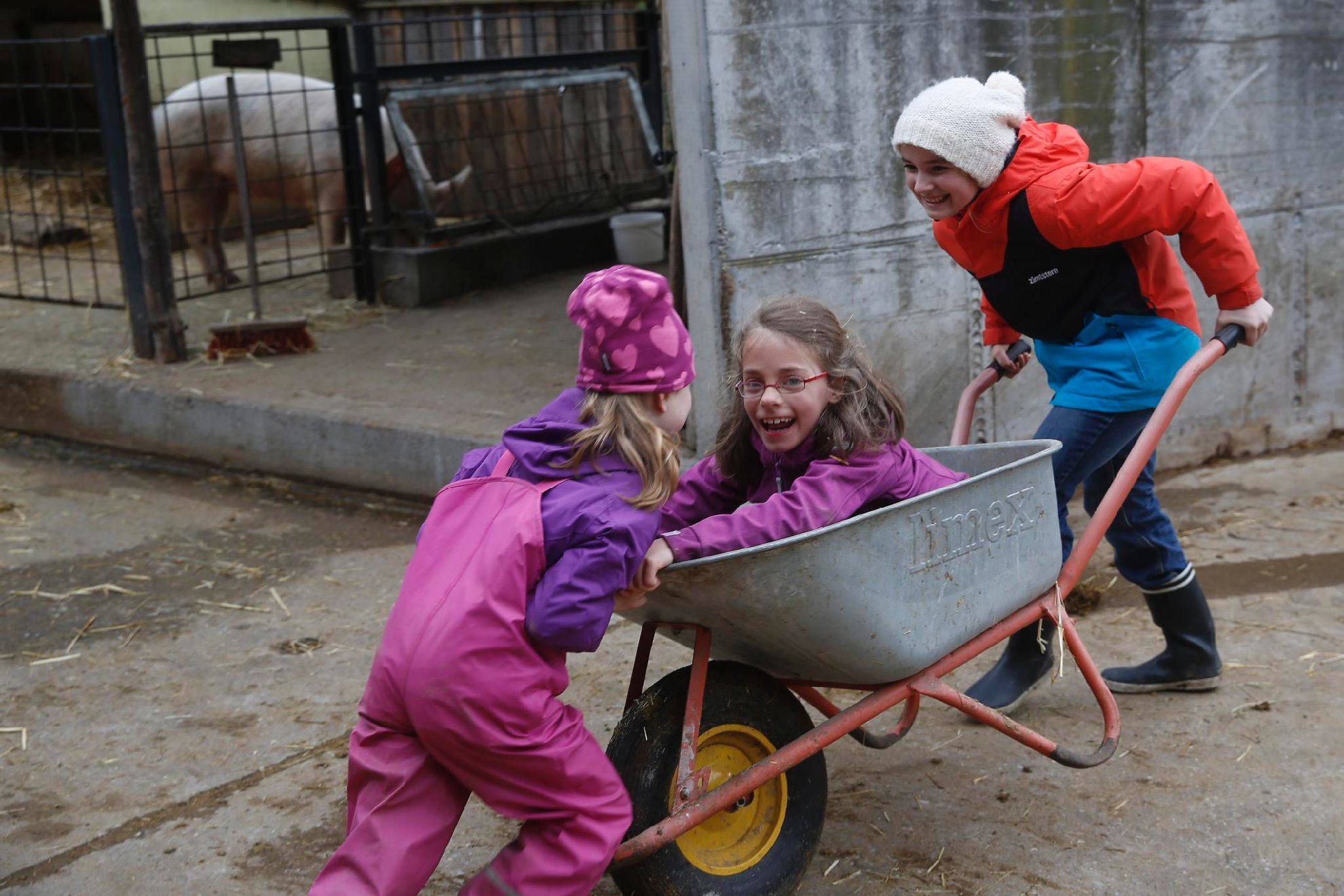 An diesem Tag steht noch etwas ganz Besonderes auf dem Programm. Bevor die übrigen Tiere versorgt werden, sollen die Kühe auf die Weide getrieben werden. Schließlich ist Frühling, da dürfen die Wiederkäuer raus. Das freut sie ganz offensichtlich. Bekundet wird’s mit lautem Muh-Gebrüll. Luber öffnet die Tür des Laufstalls und die Rinder trampeln den Berg hinunter, begleitet vom fröhlichen „Auf geht’s“ der Kinder. Während die Kühe sich auf der großen Weide vergnügen, sorgen die Jungs und Mädels fürs Futter. Ein Teil der Gruppe holt Heu aus der Scheune für den Kuhstall, der andere kümmert sich um die Schweine. Die können die Fütterung mit Molke und Getreide laut grunzend kaum mehr abwarten. Sind die Mägen gefüllt, werden den rosa Rüsselträgern die Borsten gestriegelt. Und zwischendrin: Da wird ganz viel gelacht und Unfug gemacht. Schließlich ist ein Bauernhoftag ganz ohne Schubkarrenrennen und Schabernack im Heuschober auch nicht denkbar.