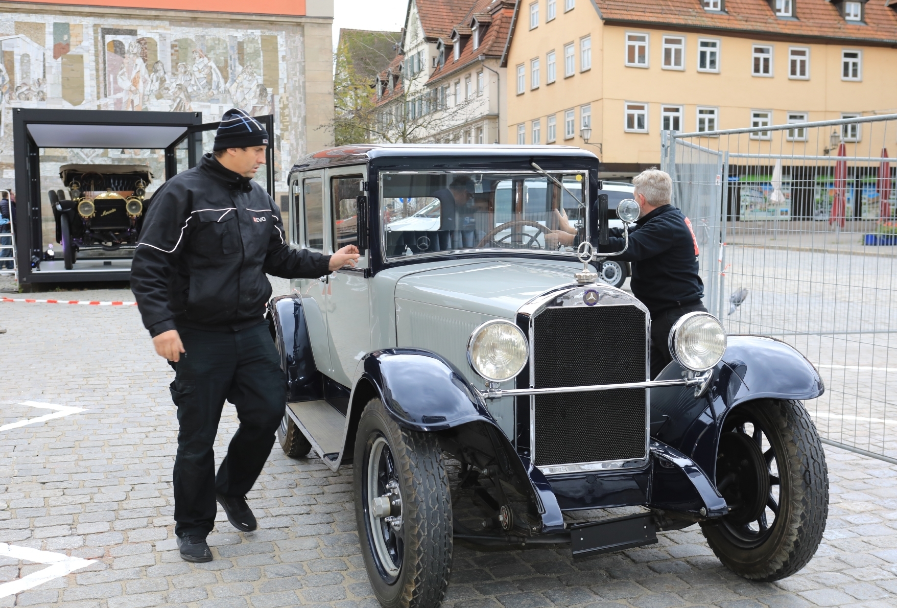 38 PS und eine Höchstgeschwindigkeit von 80 Kilometern pro Stunde. 1930 ein flottes Auto, heute ein Fahrzeug mit historischem Wert: Seit kurzem steht der Mercedes 8/38 Typ Stuttgart 200 in Graublau auf dem Unteren Marktplatz. Im Vergleich zum „Mercedes Simplex Doppelphaeton“, der mehr wie ein Schiff, weniger wie ein