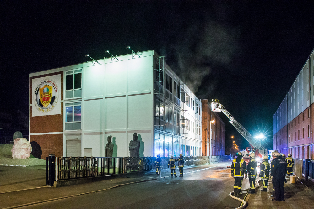 Am Dienstagmorgen gegen 4 Uhr entdeckte ein Zeitungsausträger einen Brand im Gebäude von Thomas Hornauer in der Jakob-Schüle-Straße. Im dritten Obergeschoss der Edelsteinausstellung brannte der unter Renovierung stehende neue Ausstellungsbereich mit Thronsaal. Mehrere Fenster platzten aufgrund der Hitzeentwicklung. Das Feuer erstreckte sich hauptsächlich auf den Ausstellungsraum.