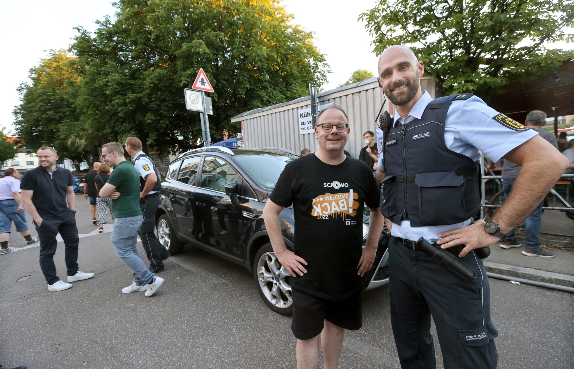 "Schön und friedlich", so lautet die Zwischenbilanz von Polizeirevierleiter Marc Henninger am Sonntagnachmittag (17.7.). Für ihn ist’s, wie für Oberbürgermeister Bernd Hornikel auch, die erste SchoWo im Amt. Und tatsächlich war's am Samstag auch erstaunlich ruhig. Zu tun hatten die Streifen, die ständig auf dem Festgelände unterwegs sind, aber trotzdem: Fünf Körperverletzungen, zwei Verstöße gegen das Betäubungsmittelgesetz und einen tätlichen Angriff auf Polizeibeamte mit glimpflichem