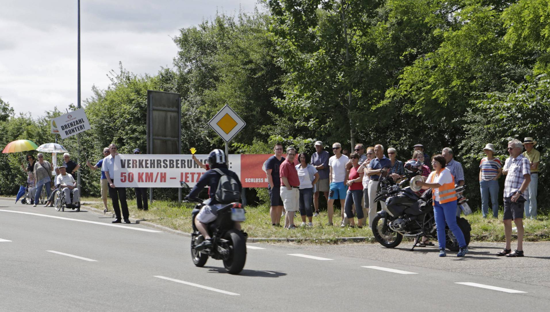 Aufgerufen zu der Demo hatte das Spittler-Stift. Heimleiterin Michaela Salenbauch ist zugleich selbst als Anwohnerin betroffen. Sie steht am Samstag mit zwei metallenen Topfdeckeln an der Straße. „Da kommt wieder einer“, ruft sie und haut die Deckel gegeneinander, als sich ein Motorradfahrer nähert – bricht dann aber ab: „Ach, des isch der Jürgen.“