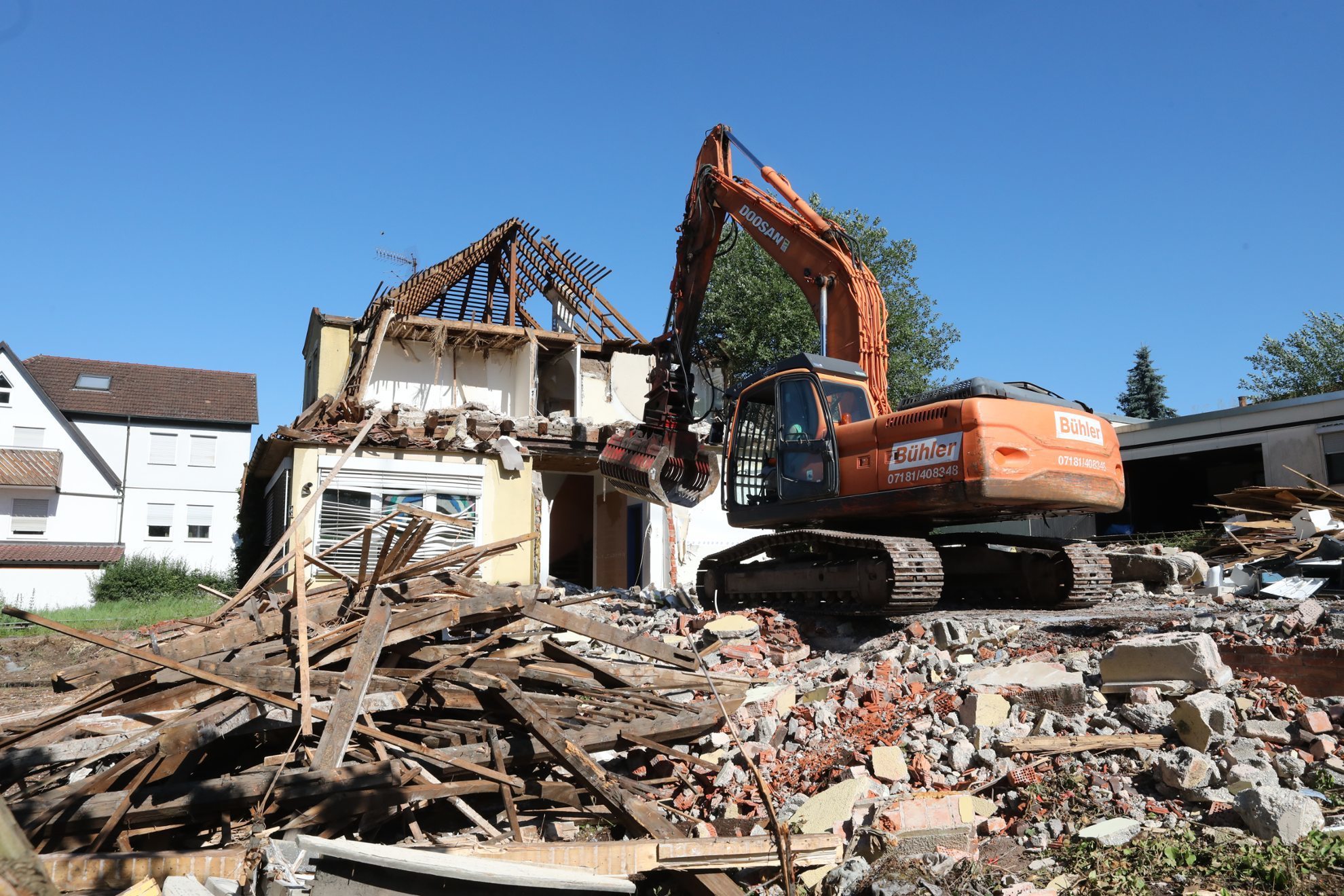 Das Dach ist abgedeckt, die Ziegel liegen ums Haus verstreut, es wächst der Haufen aus Holz und Steinen, die der Bagger schon aus dem Haus gerissen hat: Der alte Kindergarten in der Wilhelm-Enßle-Straße im Remshaldener Ortsteil Geradstetten wird abgebrochen. In zwei bis drei Tagen, wird das Haus verschwunden sein, danach muss auch der Flachdachbau daneben dran glauben. Mit dem Abriss schafft die Gemeinde Remshalden Platz für den Neubau einer viergruppigen Kindertagesstätte mit Wohnungen. In einem Architektenwettbewerb wurde dafür wie berichtet bereits ein Entwurf ausgewählt.