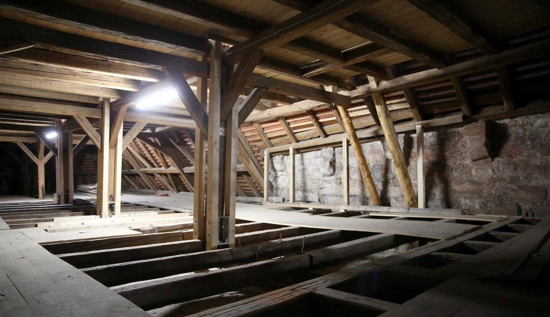 Leicht schief stehen die Holzbalken in der Mittelstütze des Dachstuhls über dem Chor. Auch das Laienauge erkennt: So sollte das eigentlich nicht sein. Mehr als 300 Jahre haben diese Balken bereits das Dach getragen, seit der Innensanierung der Stadtkirche vor vier Jahren werden sie von Hilfskonstruktionen stabilisiert. Damals wurde folgendes Problem entdeckt: Das Holz saß auf der Mitte des Chor-Gewölbes auf und gab den Druck des Dachs damit nach unten weiter. Die Konstruktion war aus dem Gleichgewicht geraten.
