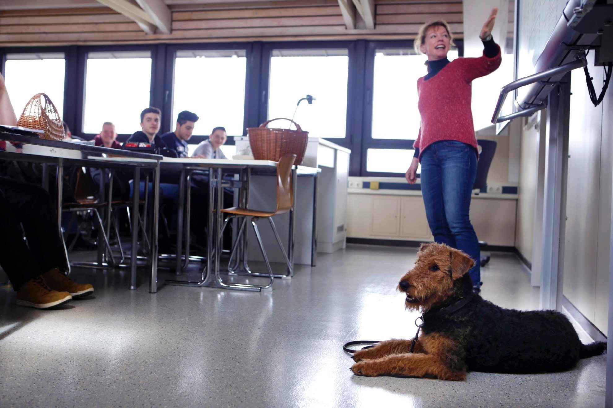 Das alles bestätigt Ines Held in ihrer Entscheidung, regelmäßig mit Hund in den Unterricht zu kommen. Auch die Wahl eines Airedale-Terriers mit seinem offenen, vertrauensvollen, freundlichen, couragierten und intelligenten Charakter fiel bewusst. Da regelmäßig die Unterwolle entfernt wird, ist der Terrier mit seinem drahtigen Deckhaar selbst für Allergiker kein Problem. Und da die Deutschlehrerin Panya schon als Welpen mit in die Schule genommen hat, ist sie die Situation im Klassenzimmer und im Schulhaus gewohnt.