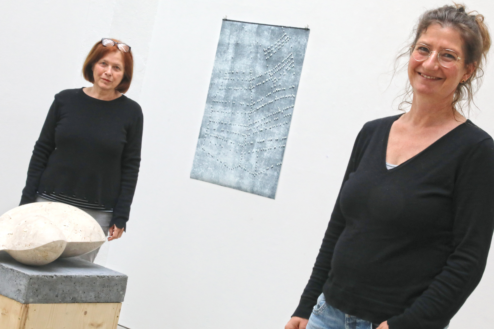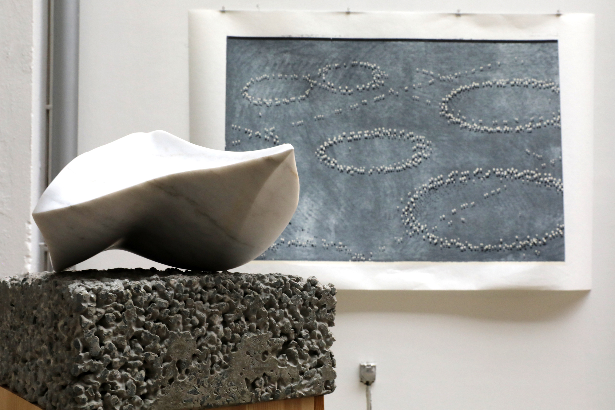 Inmitten von sieben anderen bauchigen Steinplastiken steht da auf dem Boden der Q-Galerie das Stück Nr. XXII der Serie „inside out“ von Monika Majer. Ein knubbeliges Kerlchen, oder welches Geschlecht auch immer - vielleicht „Gnömchen“ mit Genderstern? - wir dem Werk zuschreiben wollen.