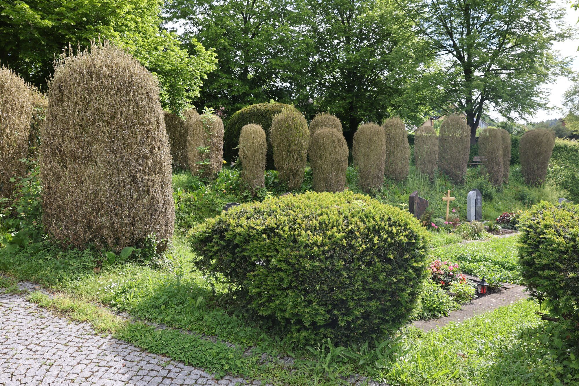 Auf dem Friedhof in Schornbach bietet sich derzeit ein verstörendes Bild: Rund 50 hochgewachsene und mindestens 40 Jahre alte Buchsbaumsäulen sind kahl gefressen und völlig zerstört. Der Buchsbaumzünsler, der seit ein paar Jahren in Gärten und Anlagen wütet, hat hier ganze Sache gemacht. Die Blättchen sind abgenagt, im Innern der Pflanzen sind die grünen Raupen zu sehen. „Buchs ist robust, der kann einiges vertragen, sagt Marek Lihotan, Chef der Stadtgärtner in Schorndorf. Aber diese