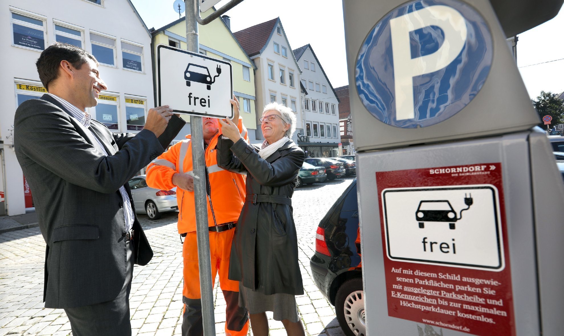 Schorndorf. Wer künftig mit einem Elektroauto in der Stadt unterwegs ist, kann alle Parkplätze kostenlos nutzen. Entsprechende Schilder hat die Stadt nun anbringen lassen. Das erste hat Oberbürgermeister Matthias Klopfer am Donnerstag höchstpersönlich montiert.