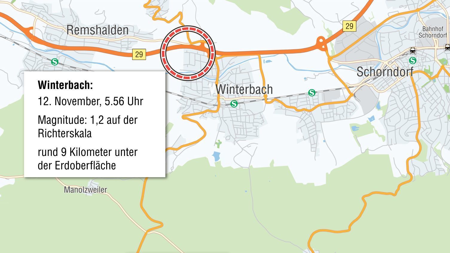 Winterbach. Am frühen Sonntagmorgen hat nahe Winterbach die Erde gebebt. Davon dürfte aber niemand etwas mitbekommen haben, da die Erschütterung schwach war und das Epizentrum sich in einer Tiefe von rund neun Kilometern befand. Laut Landes-Erdbebendienst alles kein Grund zur Beunruhigung: Es handelt sich um ein Beben, wie es in Baden-Württemberg jeden Tag vorkommt – und das auch nichts mit den Windrädern am Goldboden zu tun hat.