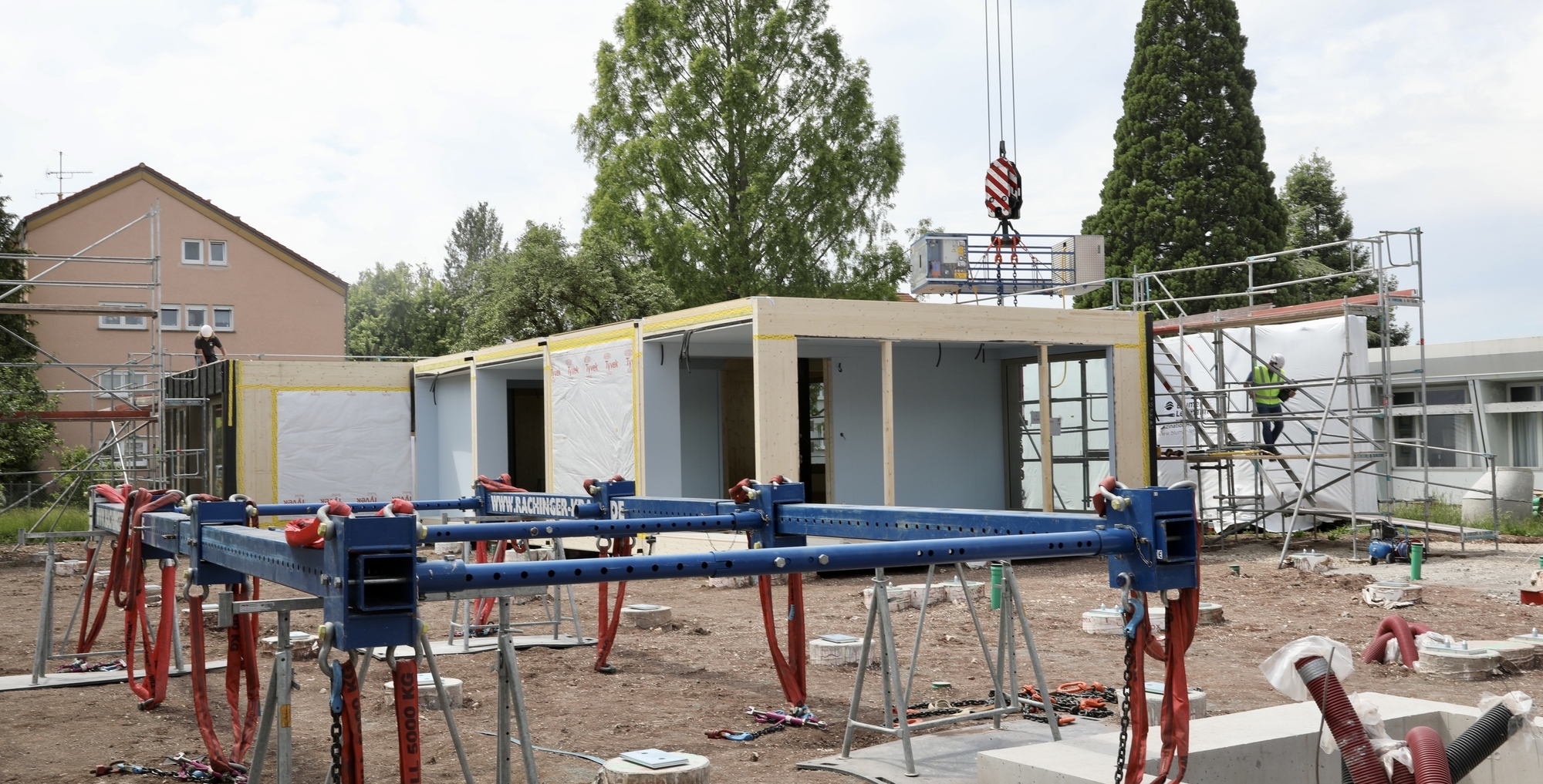 Seit März laufen die Bauarbeiten zur Erweiterung der Fuchshofschule in der Silcherstraße. Die Grundschule soll mittelfristig zur Ganztagsschule ausgebaut werden. Nun wurden die ersten Module für den Erweiterungsbau angeliefert, der schon im August fertiggestellt werden soll.