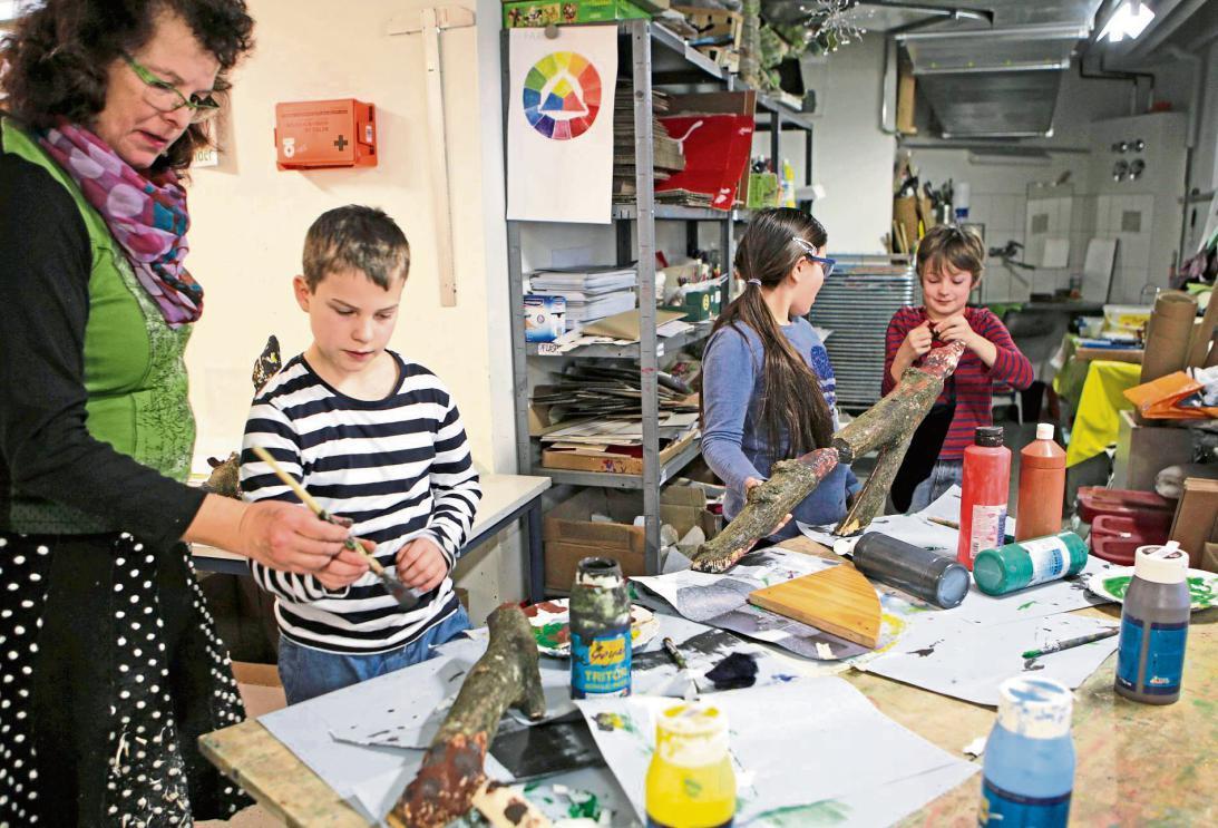 Zwei Vormittage haben sie bereits an ihren Kunstwerken gearbeitet. Doch bis sie vorzeigbar sind, müssen die Kinder noch etwas Hand an ihre Skulpturen anlegen. Ebba Kaynak unterstützt sie dabei, erklärt, aus welcher Richtung sie am besten das Holz bearbeiten, wie sie die Körperformen herausarbeiten – und verteilt immer wieder Lob, wenn die jungen Teilnehmer etwas gut gemacht haben. Bisweilen hilft sie auch nach, wenn ein Kind nicht mehr weiterkommt, greift selbst zu Hammer und Stechbeitel oder schneidet mit ihrer Elektro-Motorsäge Stücke aus dem Holz.