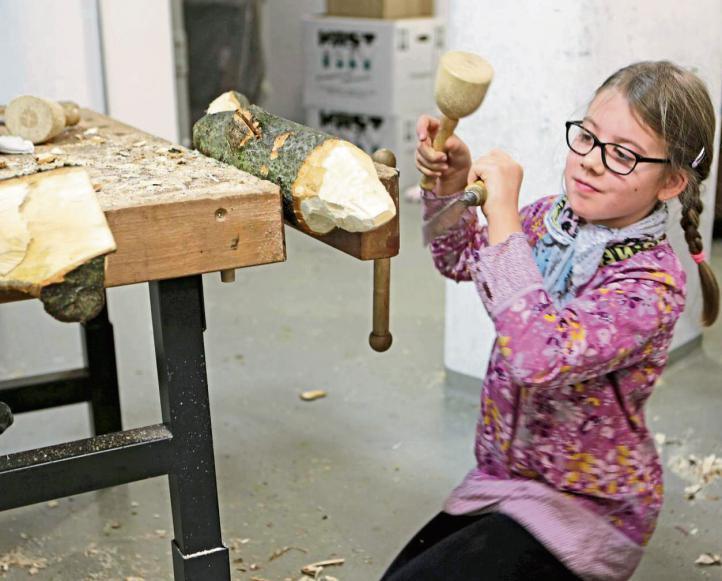 Mit Holzhammer und Stechbeitel bearbeitet Max einen Lindenast. Den Schwanz, rund und spitz zugleich, hat er schon von dem Holzstück freigearbeitet. Die Schnauze benötigt noch etwas Feinschliff. Doch die Umrisse des Fuchses sind schon klar erkennbar. Zusammen mit sieben anderen Kindern will er bis Mittwochnachmittag fertig werden mit dem Kunstwerk. Im Wohnzimmer der Familie soll er nach Abschluss des Workshops stehen.
